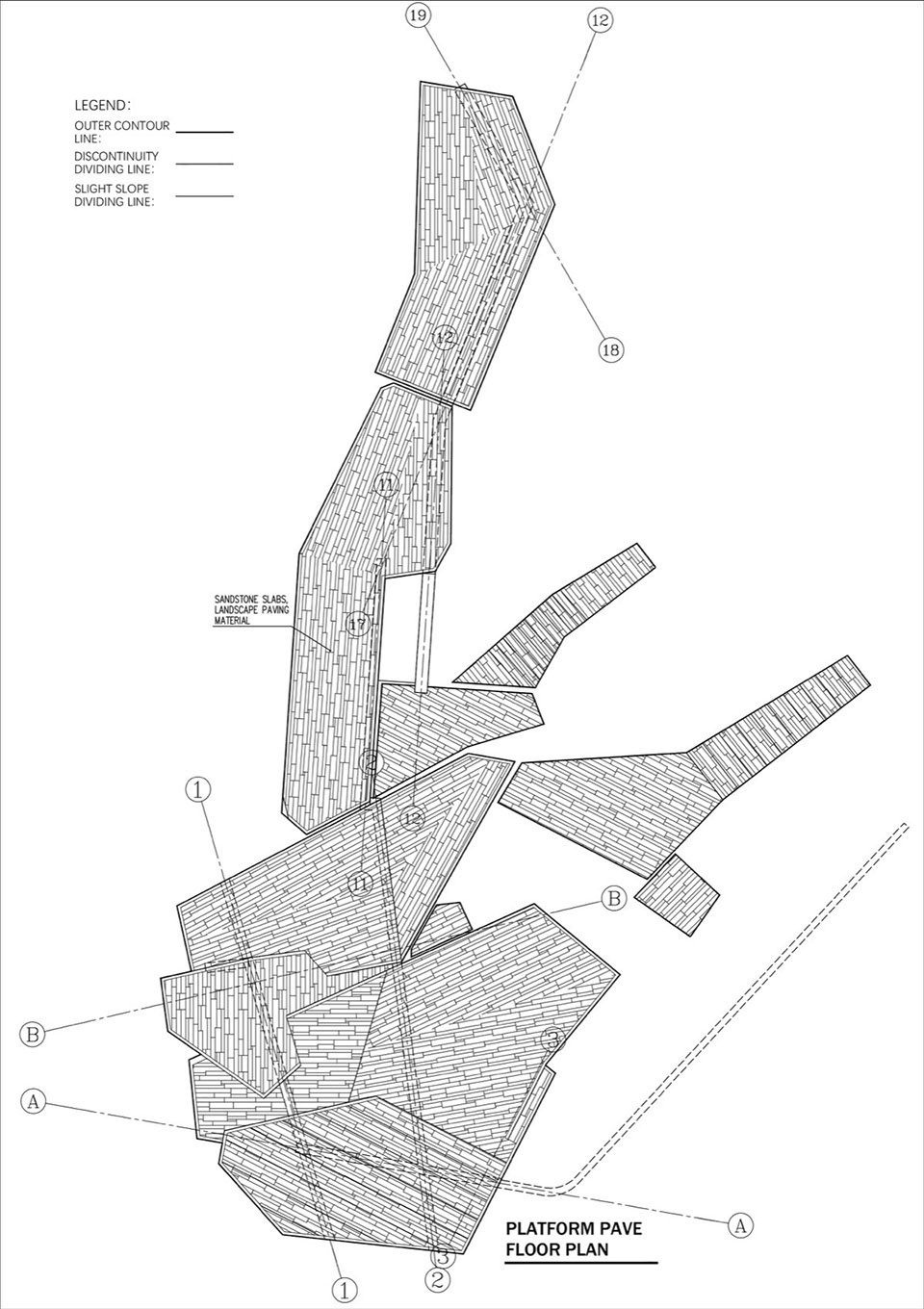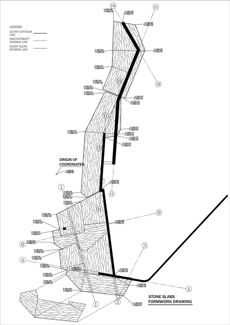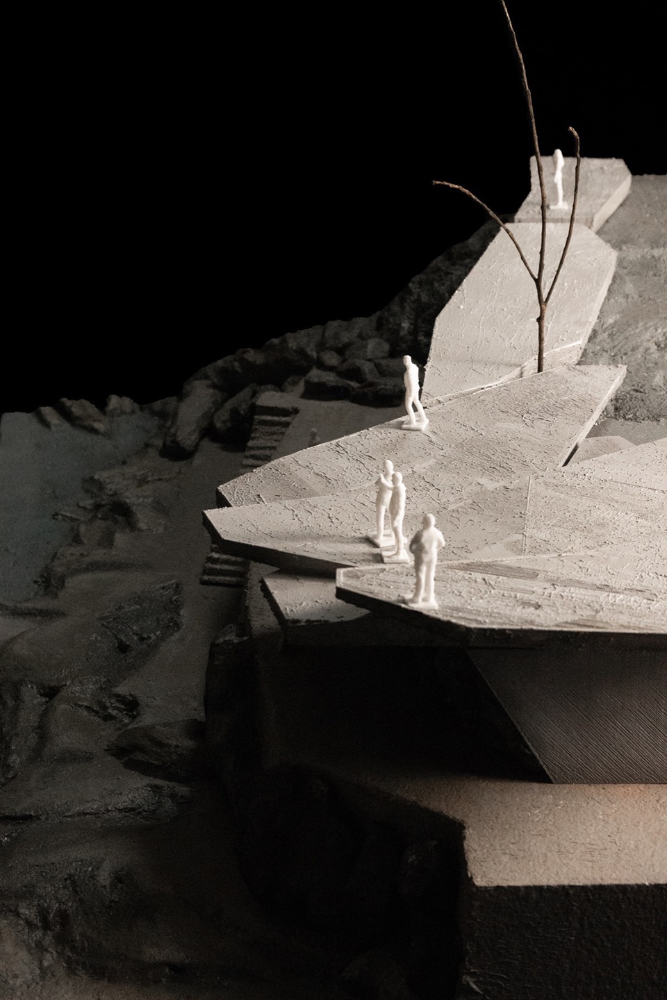 整个建筑由混凝土浇筑建造,但不同的是我们想用自然的石材来塑形混凝土。这一想法最初在模型中得到验证。搭建模型的过程也是对建造过程的设计,我们用切割成石片状的硬纸板相互叠放在木质脚手架上作为浇筑混凝土的模板。纸片相互叠放的纹理最终拓印在混凝土模型的表面。在真实建造中,纹理更加丰富的石片被叠放在木模板上,这些石片的纹理、相互搭接的褶皱最终在观景平台的底面呈现出来。当这些石片被拆除后,观景平台的底面就像是被自然雕琢的原石。而这些被拆除的自然石模板又被铺装到观景平台下方的台地上,塑造了一个如洞穴般的空间。在此,人工与自然的边界被破除,建筑不再是建筑,而是自然的镜像。