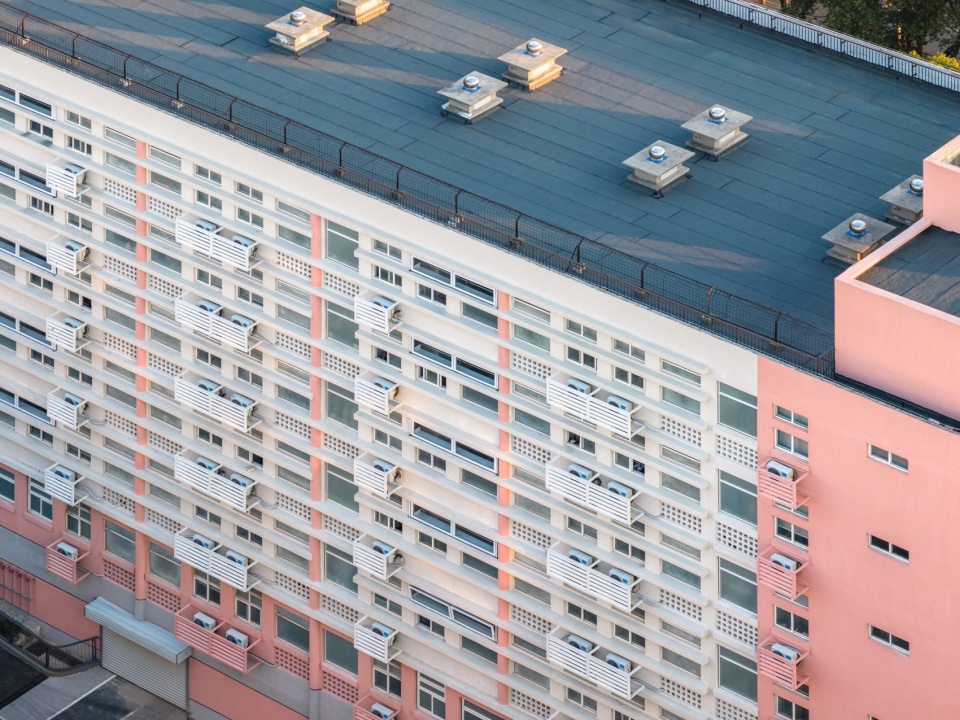 After renovation, the façades adopt a warm palette, where white elements contrast with soft pink walls to create a vivid interplay of light and shadow. Inside, the original undivided wet and dry layout was replaced with clearer spatial zoning, later-added colors were removed, and material standards were upgraded, resulting in rental units that are clean, bright, and cost-effective.