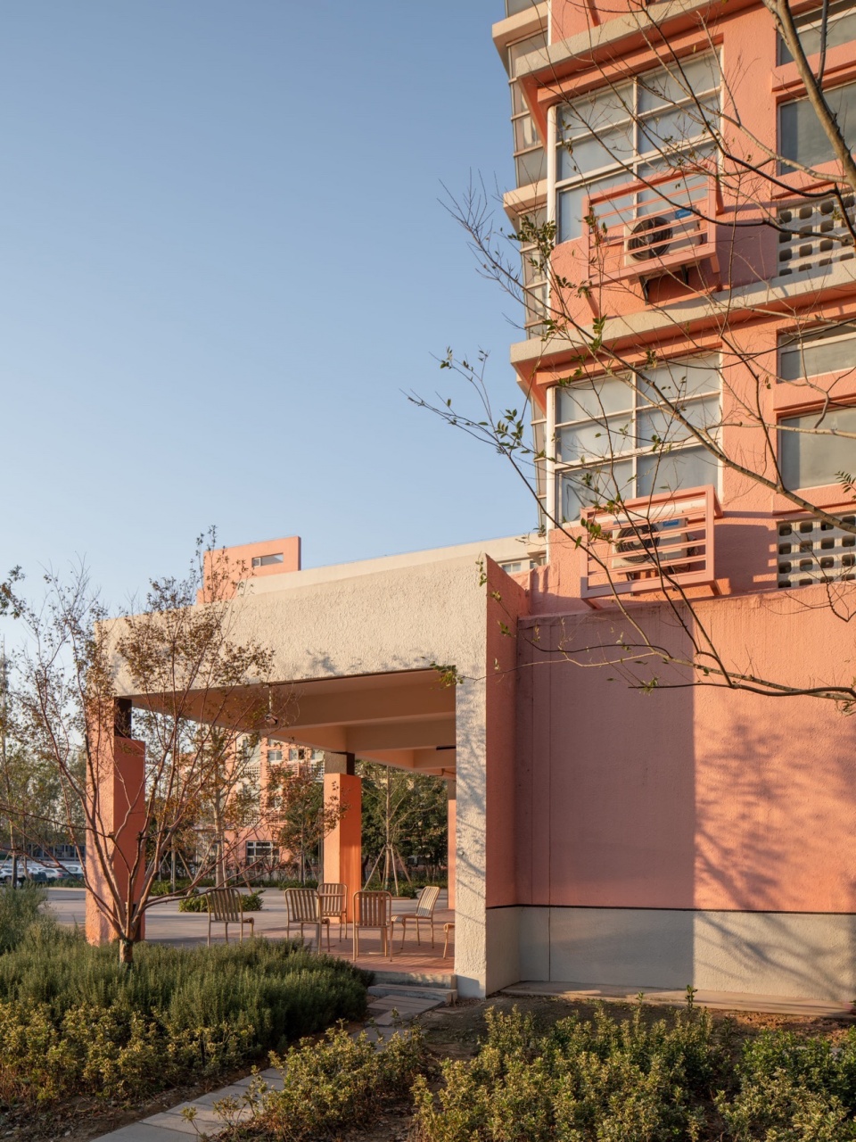 整修后的建筑立面色彩温暖,白色构件和粉色墙面形成强烈的对比和光影效果。建筑的室内空间则摈弃了原本干湿不分离的设计,增加空间分割、去除后期添加的色彩、提高材料标准,呈现了简洁明快、性价比高的租住空间。