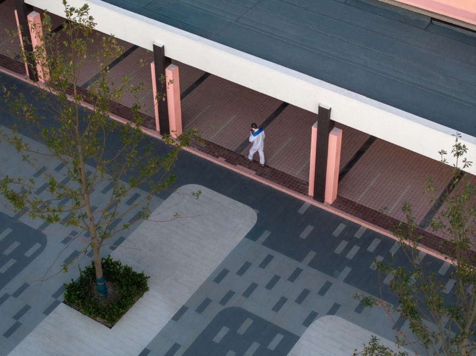 宿舍建筑之间的连廊在延续原有空间结构的基础上,做了更中性更通透的颜色和材料处理,使连廊从单纯通道转变为具有识别度的公共界面,为它成为整个园区生活轴线提供了基础。