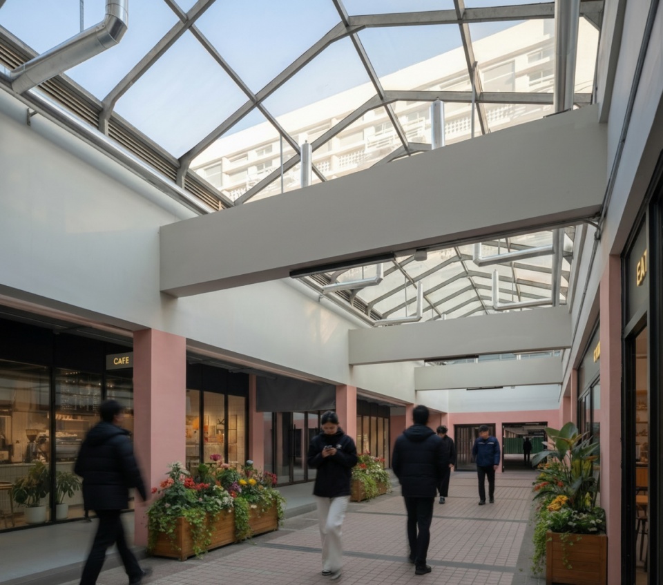 The corridors connecting the dormitory buildings retained the original spatial layout but were treated with more neutral and transparent colors and materials. This transformation elevated the corridors from mere passageways to recognizable public interfaces, establishing a backbone for the park’s overall circulation and daily life.