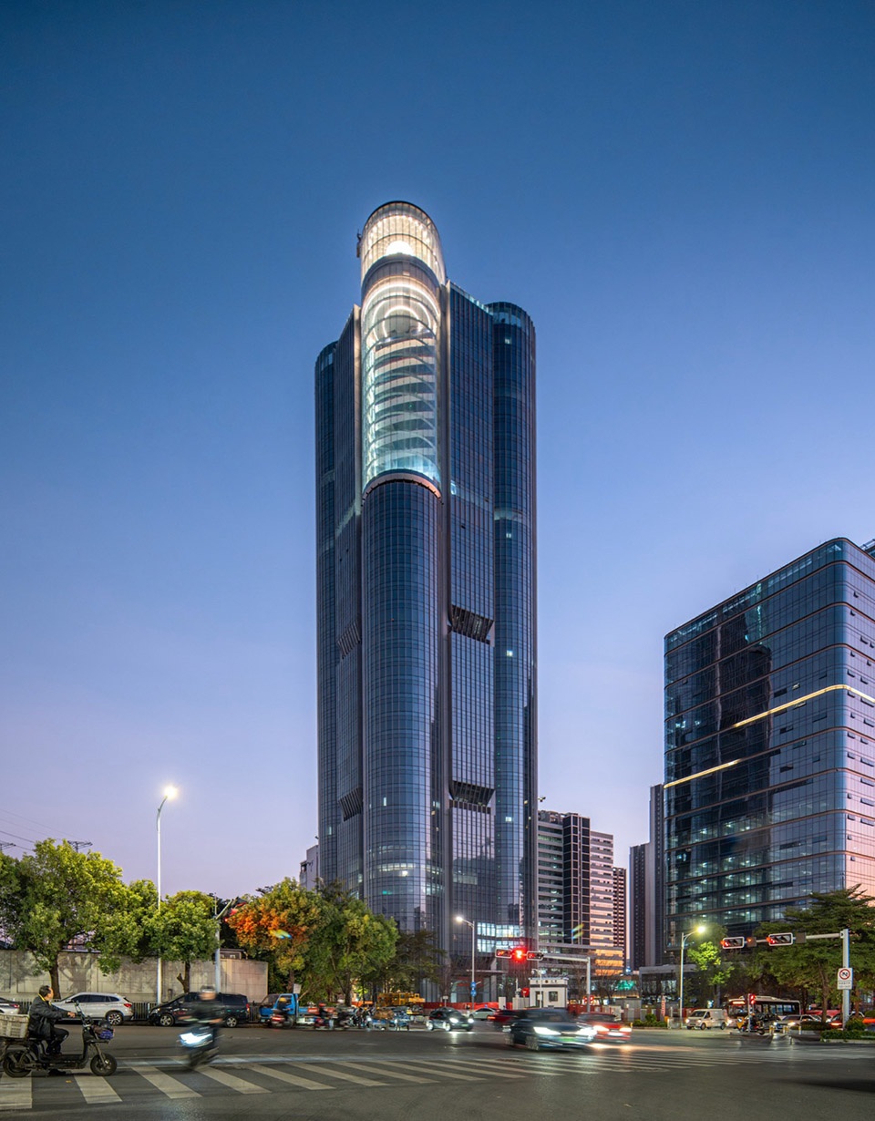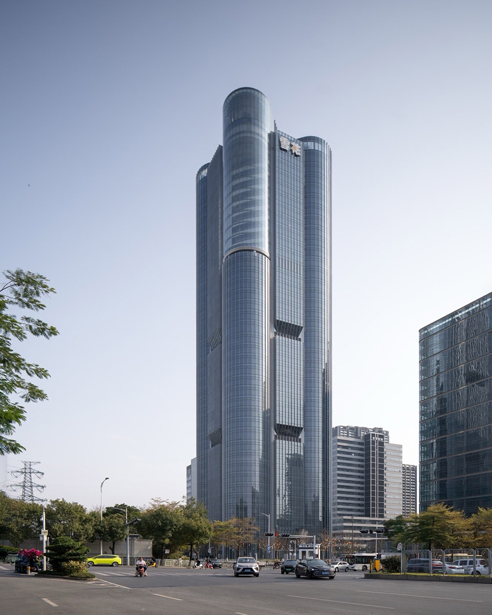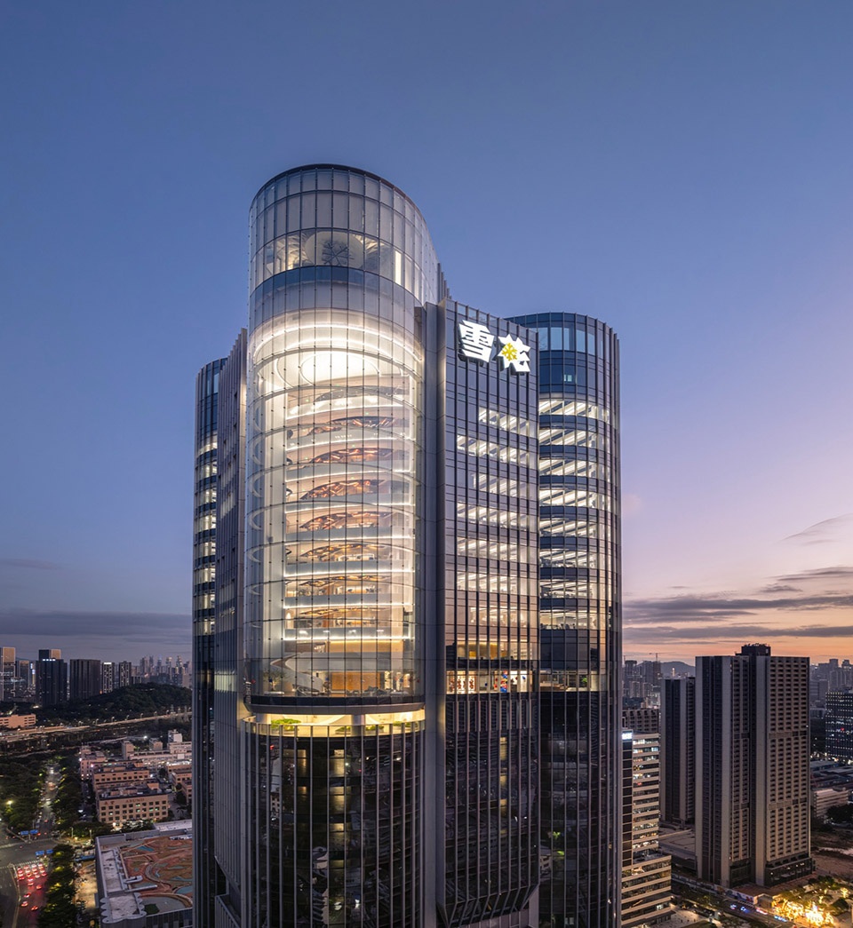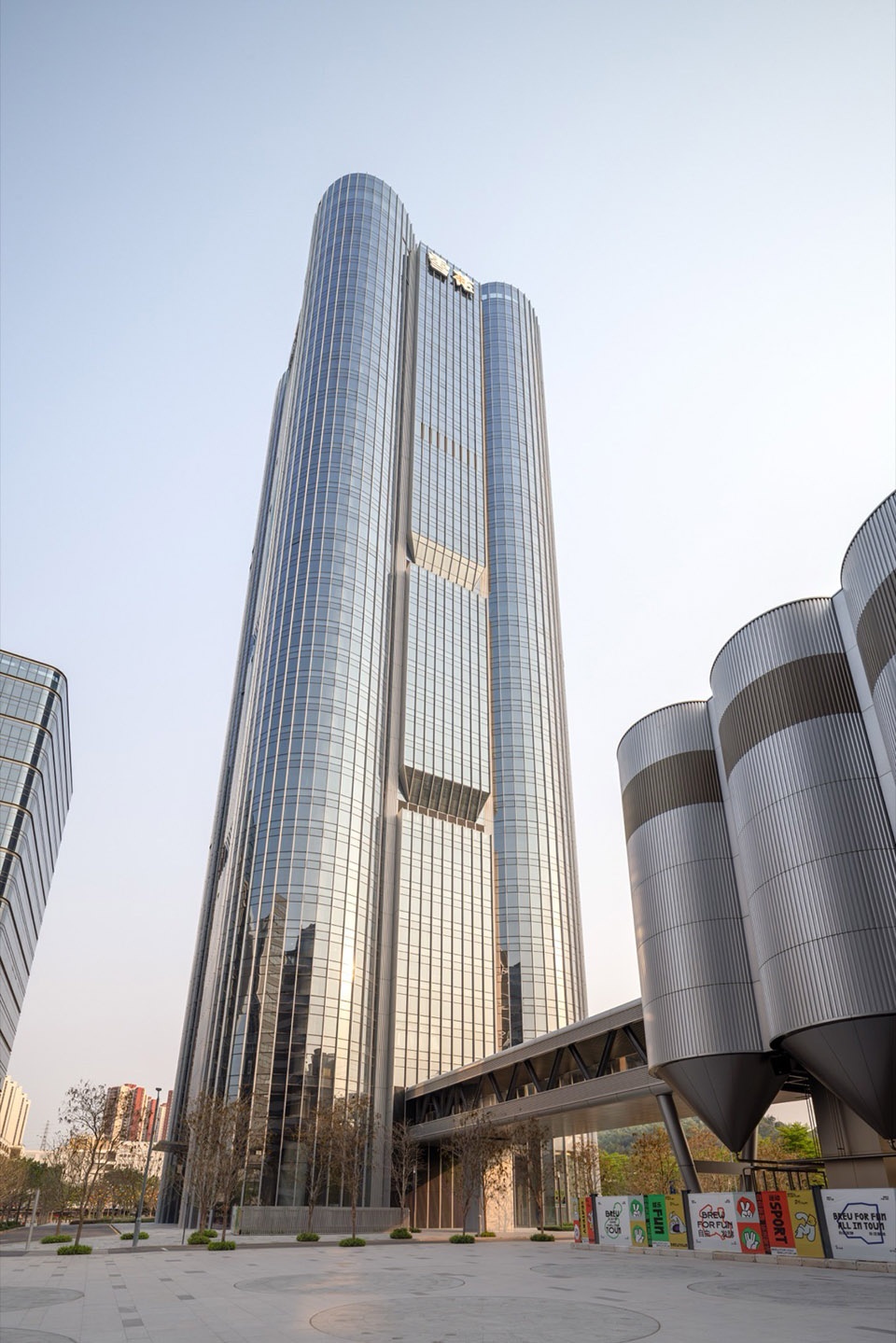 The Headquarters stands as a striking vertical landmark at Bao’an’s northern gateway. Featuring curved and linear façade elements reminiscent of a ‘Snowflake grain silo’, the tower blends industrial heritage with modern form.