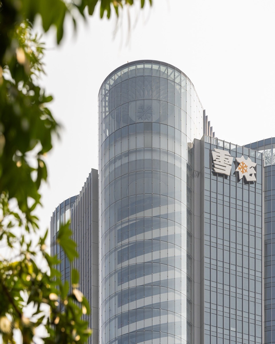 Aedas:雪花啤酒总部大厦策略性落位于双主干道交叉口,以挺拔身姿屹立于宝安“山海连城”规划的北端点,并成为片区城市更新的“源点”。建筑形体呼应啤酒厂筒仓特征,主塔楼立面巧妙融合了大圆弧造型和平直段造型,以“雪花粮仓”的概念意向,通过圆润的塔楼形态,延续了啤酒厂深刻的文化印记。