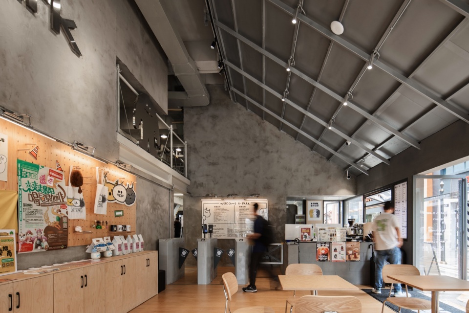The facade at the entrance is vertically flipped, forming a sloping eave that projects outward, breaking the monotony of the streetscape and inviting people into a warm hut, where a wooden, warm-toned atmosphere creates a friendly vibe.