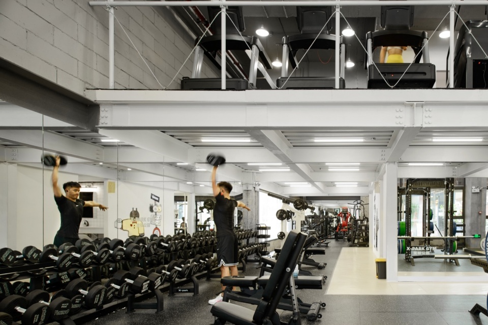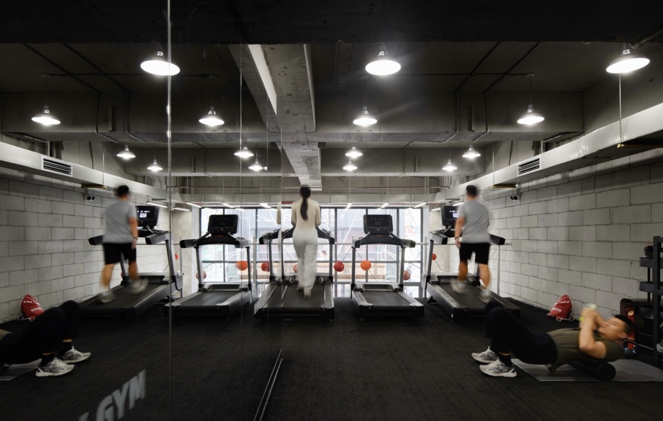 利用建筑空高,增加加层搭建出悬空训练台,设置拉伸区和跑步区。确保有氧运动时空间不显局促,减少压抑感,呼吸更顺畅。这种布局打破了传统健身房格子化的孤立感,不仅是对有限面积的高效利用,更在垂直维度上编织了视觉与能量的流动。