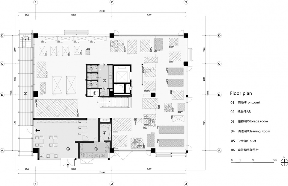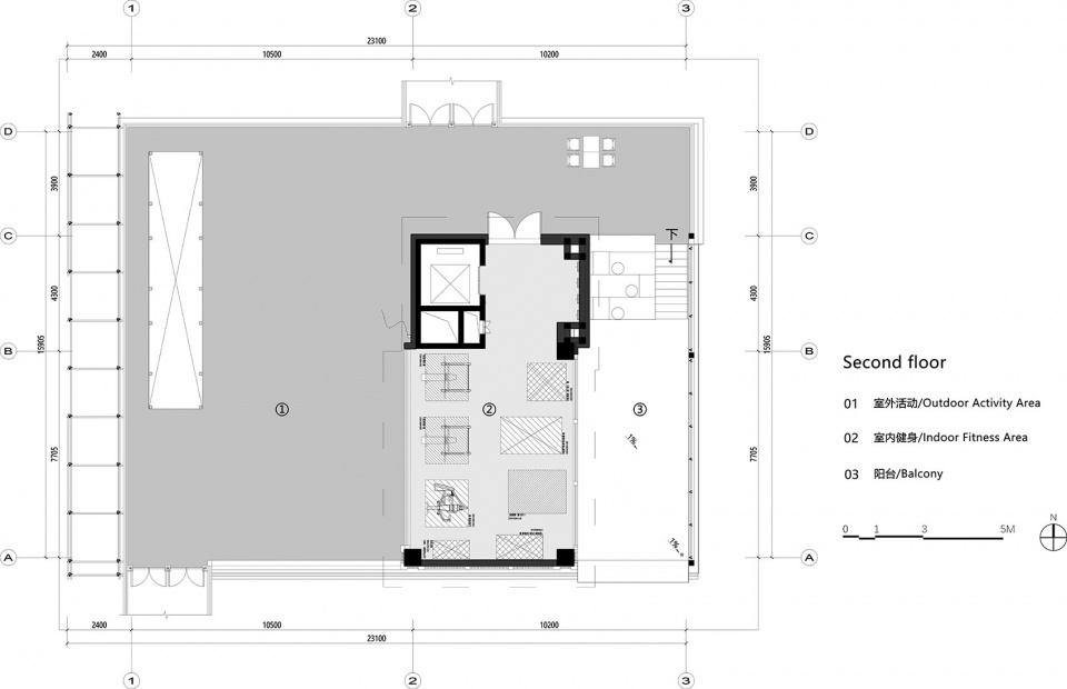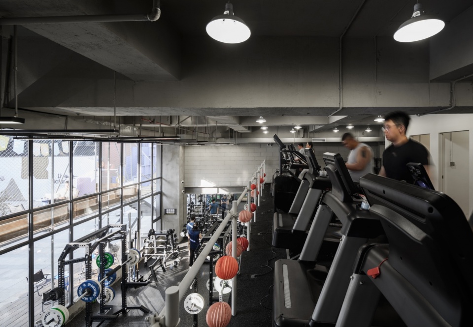 这是整个健身房采光最好的地方,是社群活动的核心。分为室内区和宽敞的露天区。露天区域被脚手架结构环抱,提供了一个独特的户外训练环境。人们可以在阳光下举办清晨瑜伽、黄昏动物流课程、小型训练营等活动,感受自然气息,用于让健身房的功能超越传统器械训练,成为连接不同运动兴趣的枢纽。