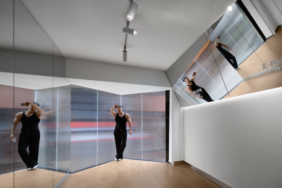A semi-transparent box protruding from the facade at a 45-degree angle creates a unique elevational effect while ensuring interior light and privacy. Inside, a full-wall floor-to-ceiling mirror and a high-angle overhead slanted mirror allow fitness enthusiasts to observe and record their training results from multiple angles. As an independent room, it provides ample privacy for members, avoiding social awkwardness.
