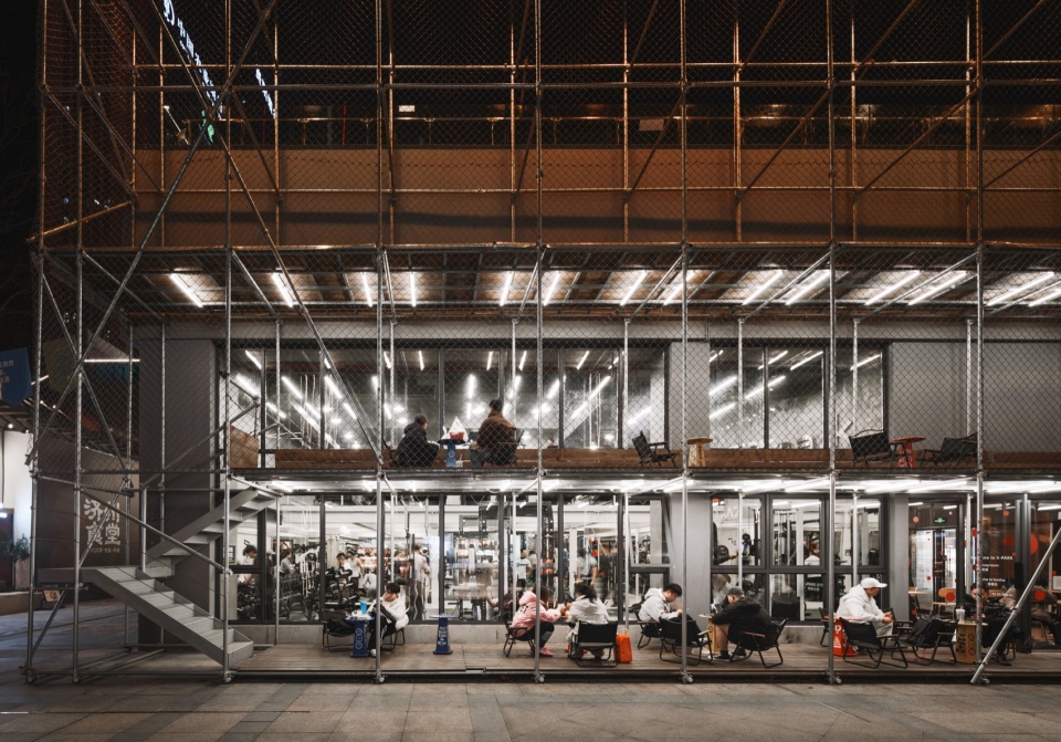 从一楼蔓延至三楼的脚手架外立面,包裹着细密的金属网,过滤阳光,形成舒适的光影。而真正妙处,在于其下自然形成的多层次外摆区。我们并未用固定桌椅填满这里,而是预留了充裕的、可灵活组合的“空白”。这里是运动间隙的喘息之处,也是一场自发小型分享会的可能场地。