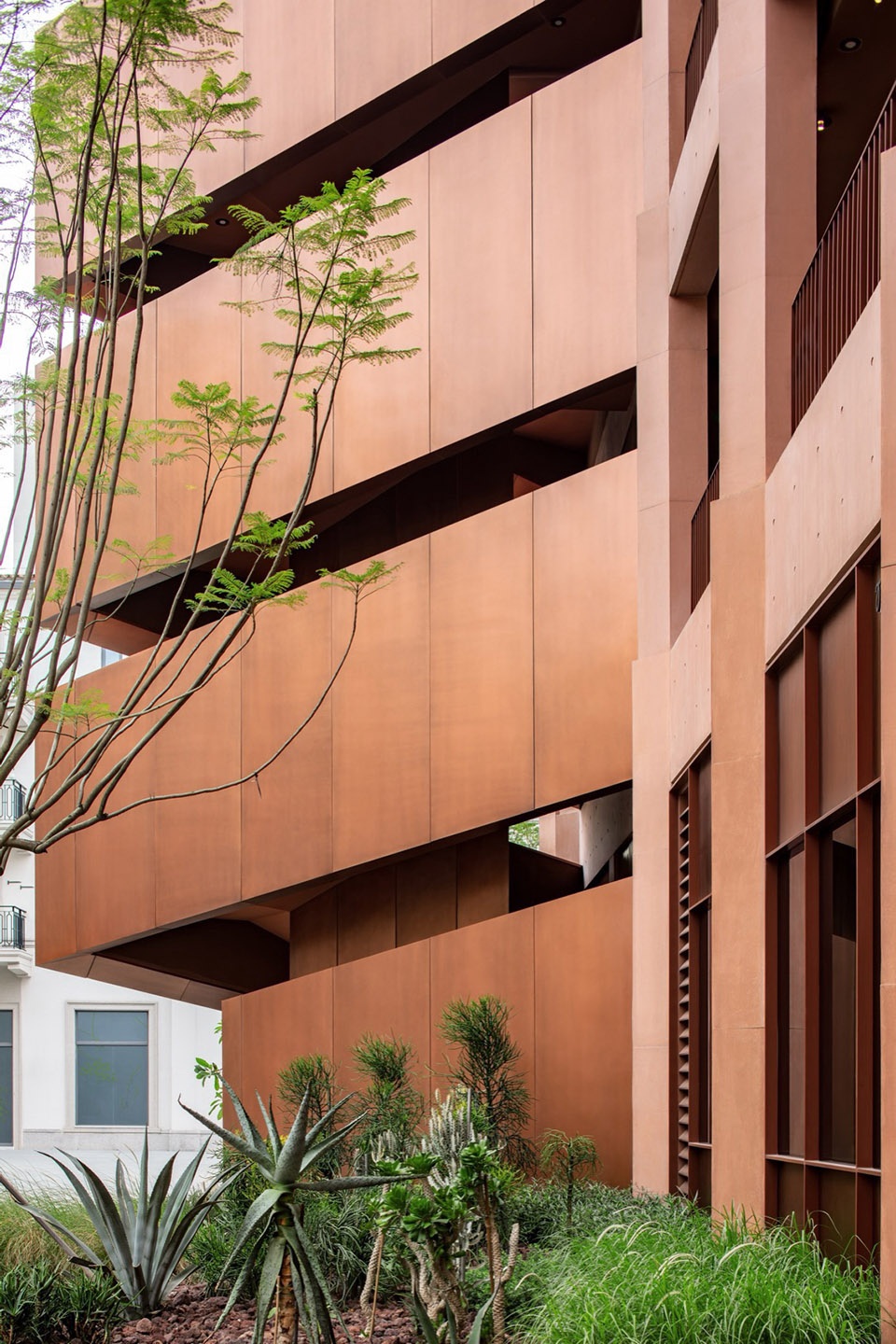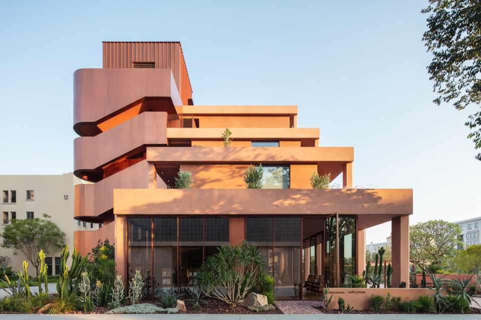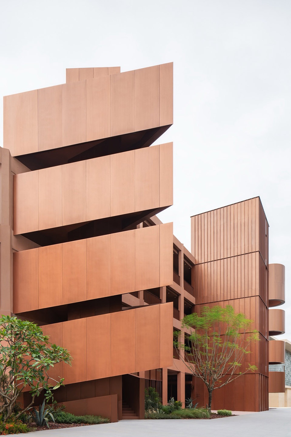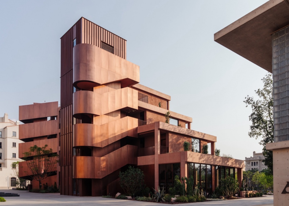 ▼红色清水混凝土立面,the building is constructed with red fair-faced concrete