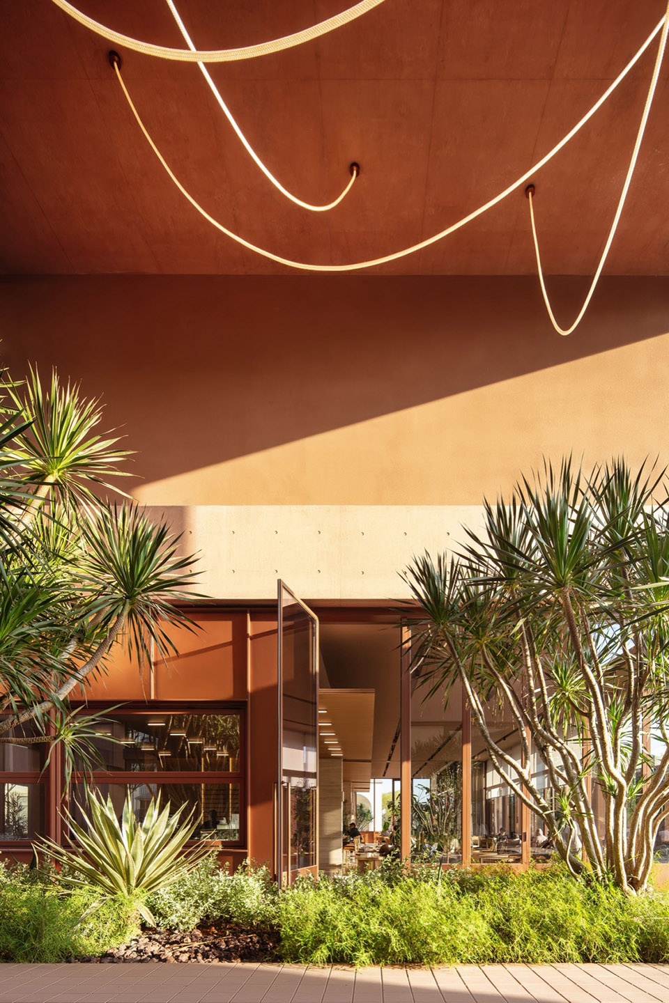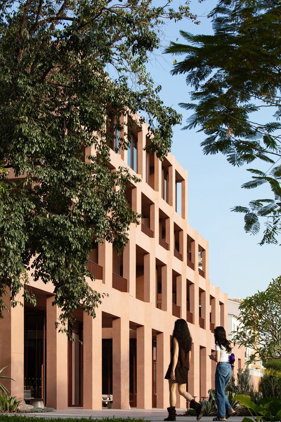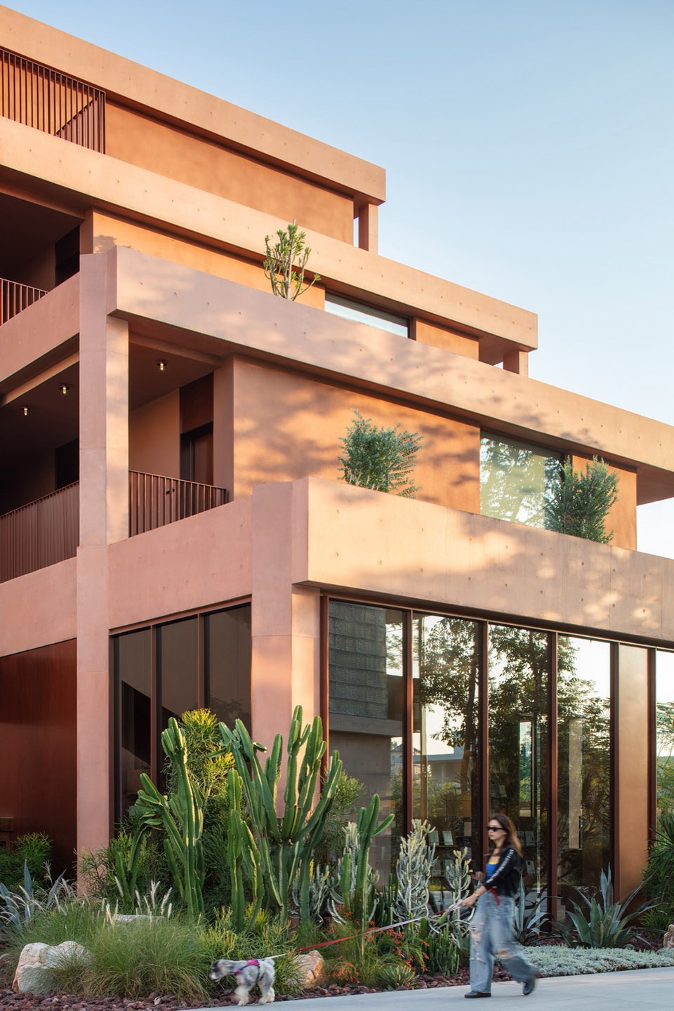 ▼红色清水混凝土立面,the building is constructed with red fair-faced concrete
