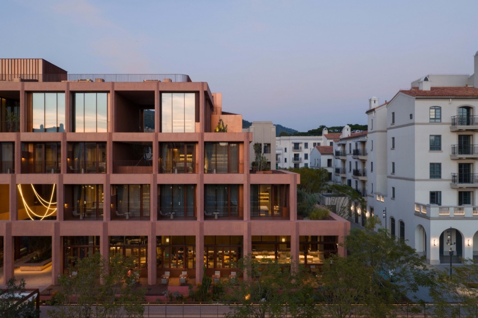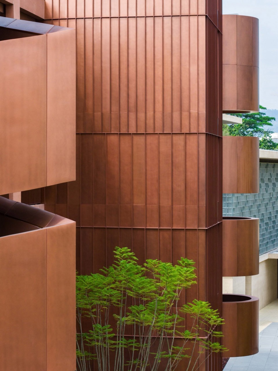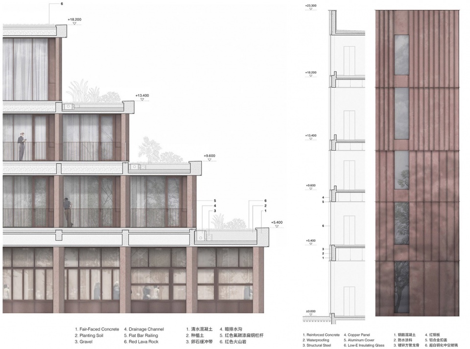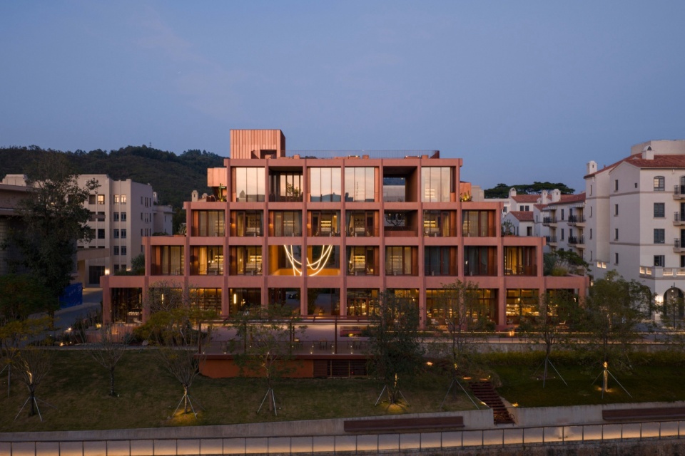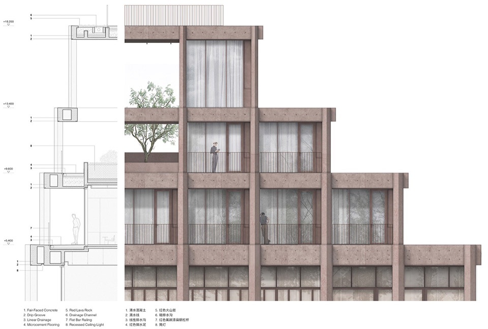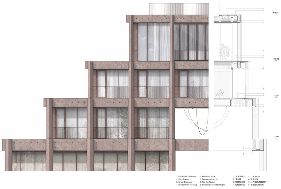 在材料方面我们选择使用红色清水混凝土来呈现建筑的主体结构,混凝土一次浇筑成型,将结构与材料最真实的呈现。低饱和度的红色像是老砖的颜色 ,也像是泥土的颜色,与混凝土天然、粗粝的质感结合,给人温暖的感觉。红色随着时间微妙的变换色调,让建筑有了表情和生命力,像是在和背后的群山一起生长。晴天时,红色的建筑与水中的倒影相呼映衬,更多了一分灵动。在与环境的对话之中,立面直线网格的坚实和厚感被柔化了,营造出轻盈的感知。与红色混凝土搭配使用的乱纹红铜板,运用在室外疏散楼梯、核心筒的外立面。金属的精致冷峻与混凝土的粗温润,在对比中加强了立面的层次感。整体材质明快的色调也让建筑从青山绿水之间跳脱出来,充满活力和愉悦的度假氛围。
