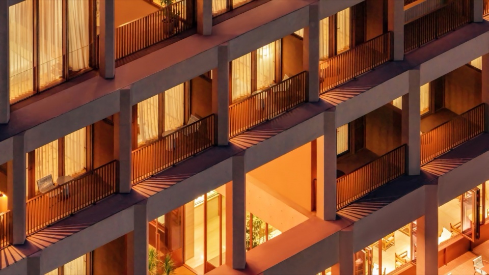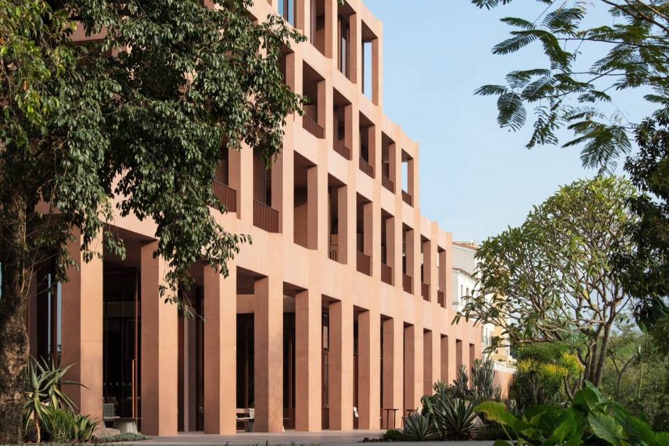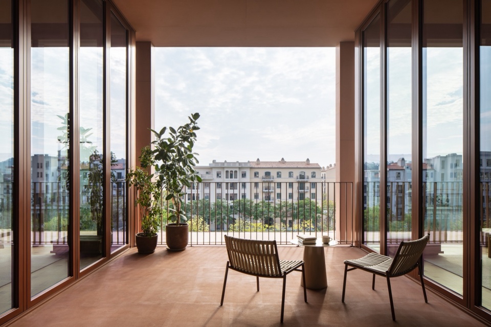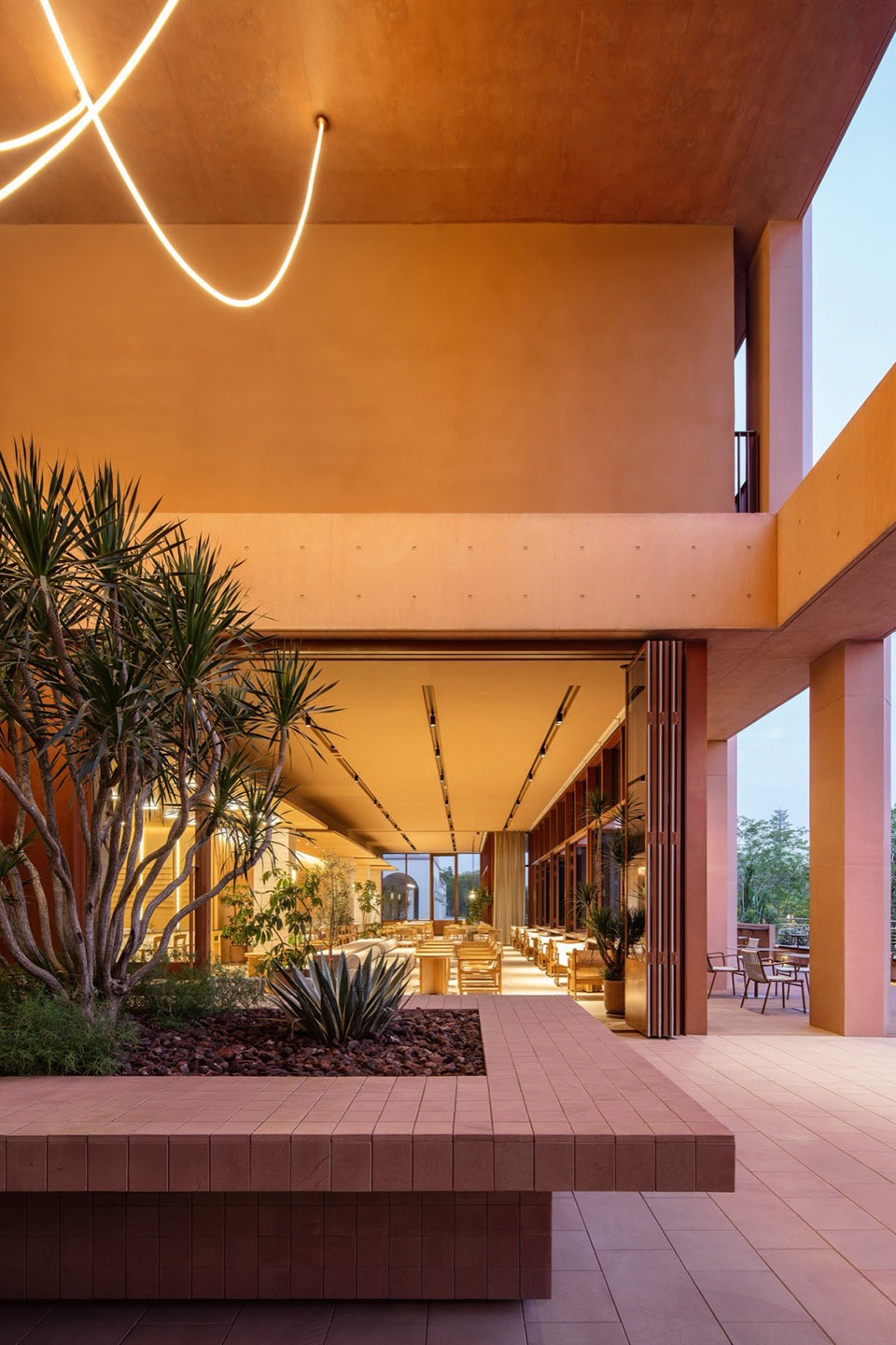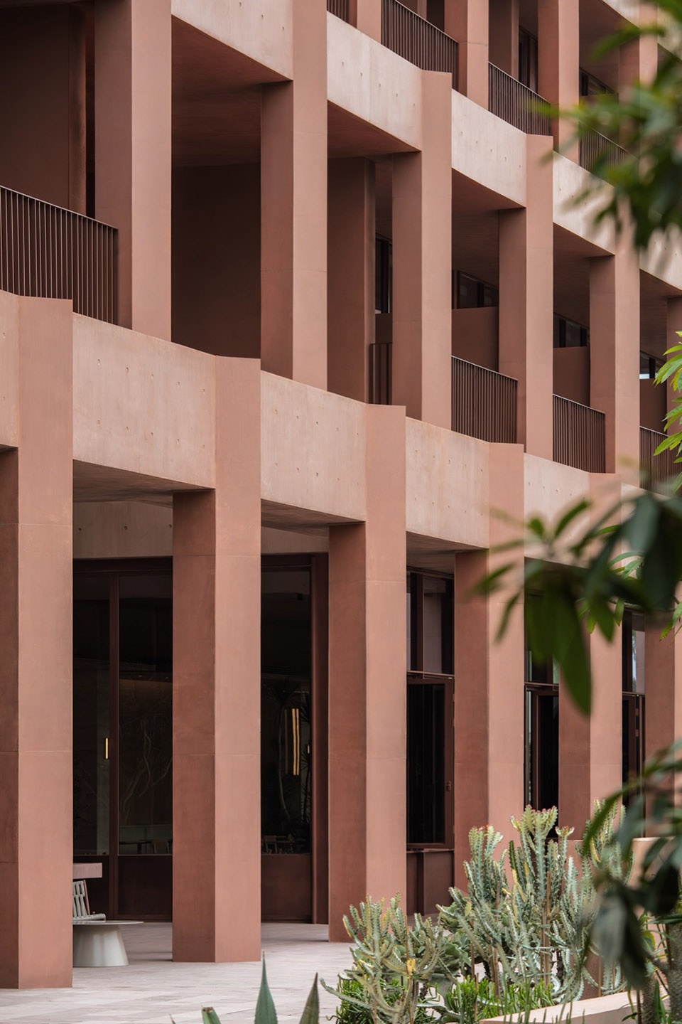 The primary structure of the building is constructed with red fair-faced concrete, cast monolithically to reveal both the material and structure in its purest form. The low-saturation red, reminiscent of aged brick and earth, complements the natural roughness of concrete, producing a warm and tactile presence. Over time, slight variations in tone give the architecture a sense of expression and vitality, as if it grows with the surrounding mountains. In sunlight, the red volume is echoed by its reflection in the water, creating a more dynamic and animated presence. Engaging with its surroundings, the façade’s linear grid is visually softened, allowing the architecture to read as lighter and more permeable. Patterned red copper panels are introduced on the external escape stairs and service cores, where the refined coolness of metal contrasts with the raw warmth of red concrete, enriching the depth and articulation of the façade. Together, the bright yet balanced material palette enables the building to stand out within the mountainous landscape, reinforcing a lively and relaxed resort character.