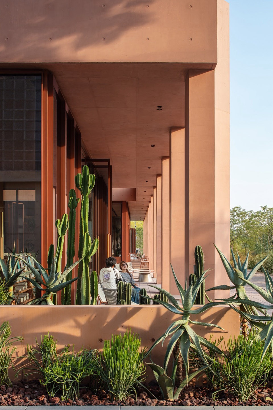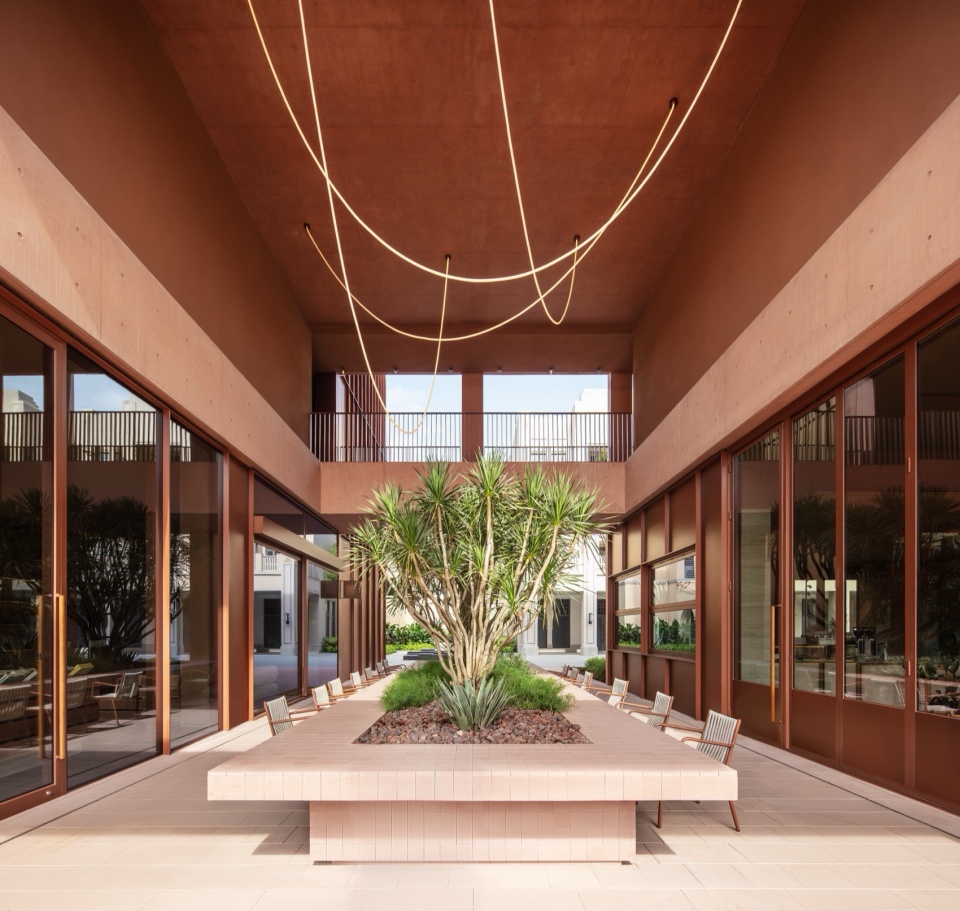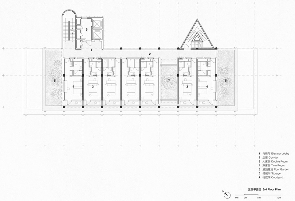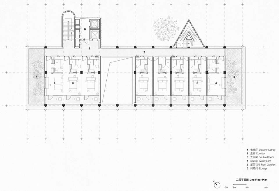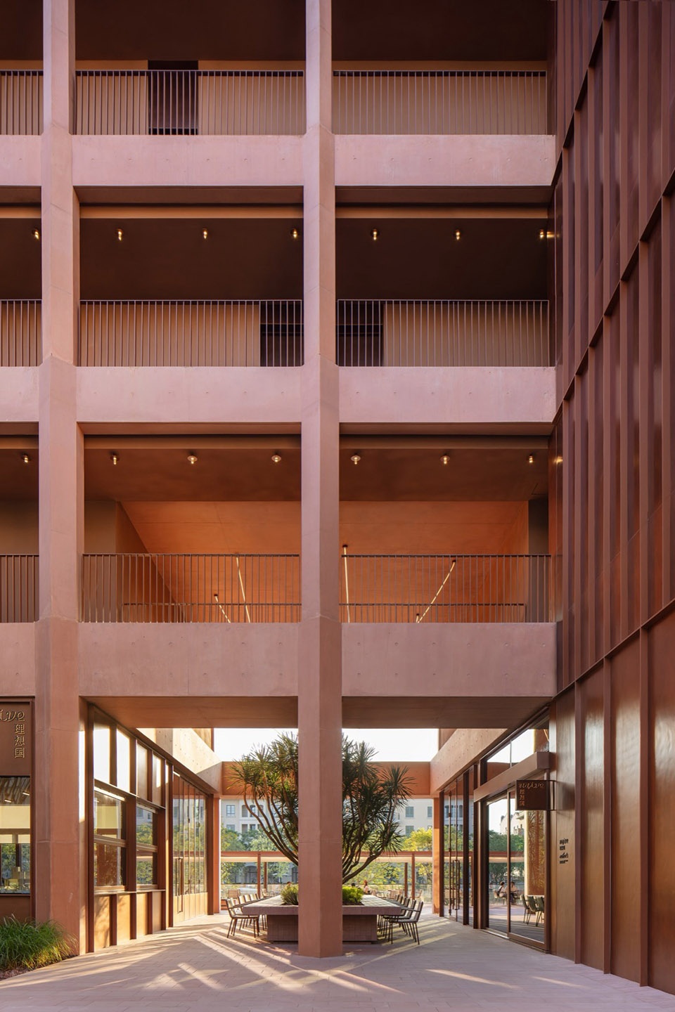 廊和院的设计让建筑有了“可以呼吸”的空间。在快节奏的现代生活中,城市空间总是在被高效的使用着,然而, 在单体建筑原本就有限的空间和范围里,我们仍然选择构建半室外连廊和架空庭院,把一定的空间贡献给自然和街道。设计上没有特意界定它们的功能,是人的活动赋予了空间意义——人的游走与自然的渗透在虚实之间悠然转换,空间也随着人和环境的变化而不断进化和生长。酒店的客人,或是社区里漫步而来的游客,在树庭院的长桌边坐下,发呆、读书、聊天、晒太阳。随着微风和光影变幻,人们的动作也自然的放缓下来,度过些许“散漫的时光”。设计相信,建筑的价值不在于宏大的叙事,而在于创造这样的微小的时刻,让人感知真实的生活和自我的存在。