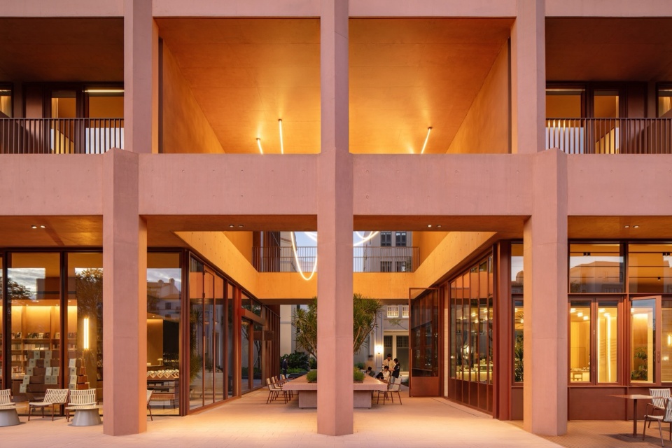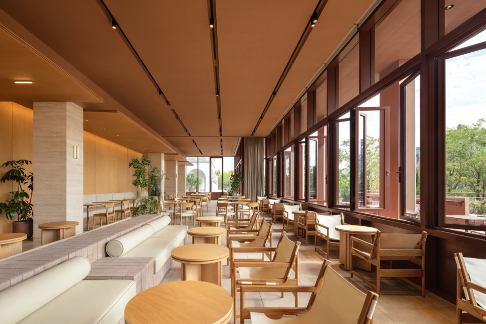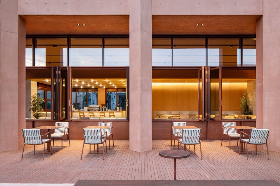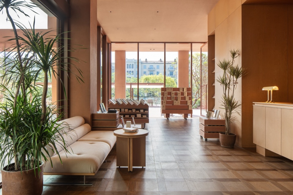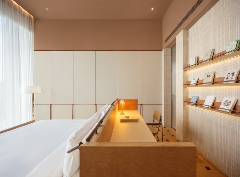 The interior atmosphere continues the building’s warm architectural language. The ground floor is organized into two spaces yet interconnected zones: a combined bookstore and hotel reception space, and a café with light dining. Rather than separating functions through fixed partitions, the public areas are conceived as a continuous and fluid spatial sequence, allowing movement to unfold freely and maximizing the inherent openness of the building.