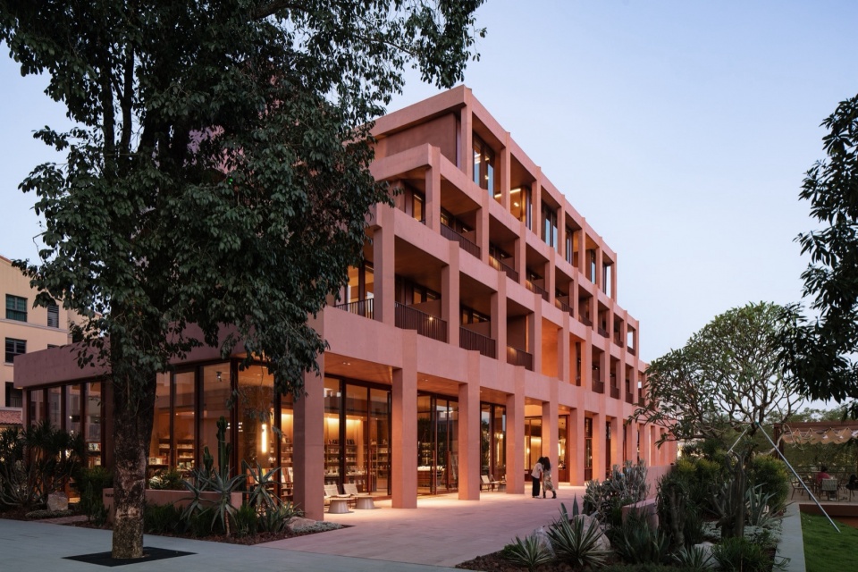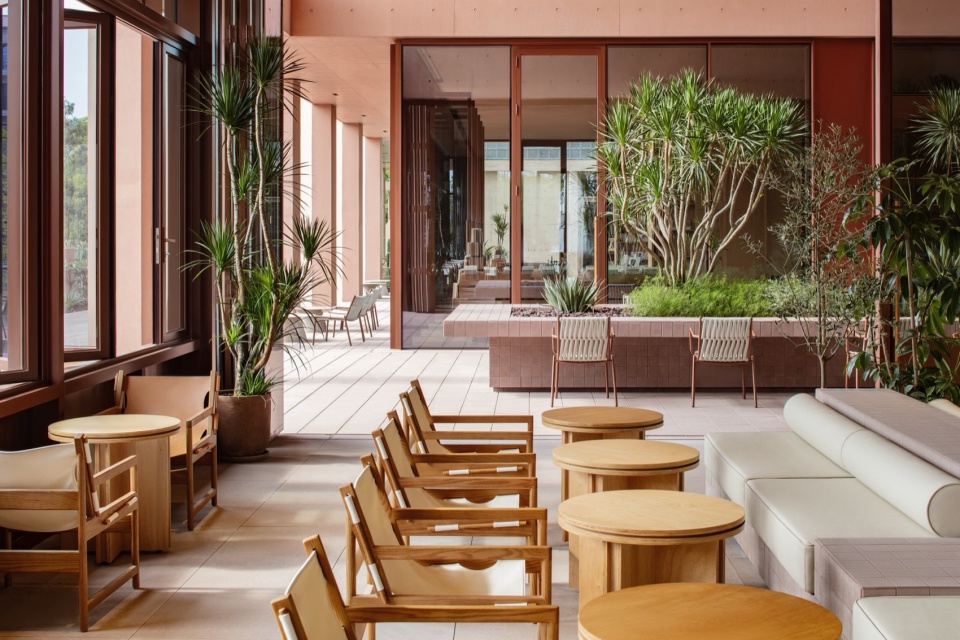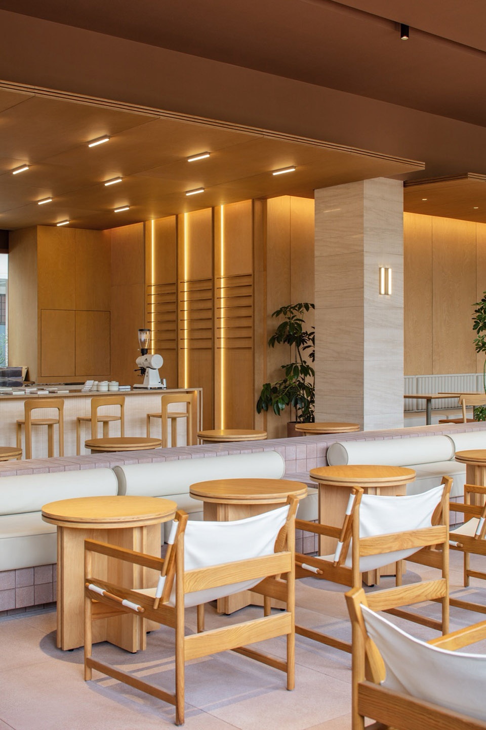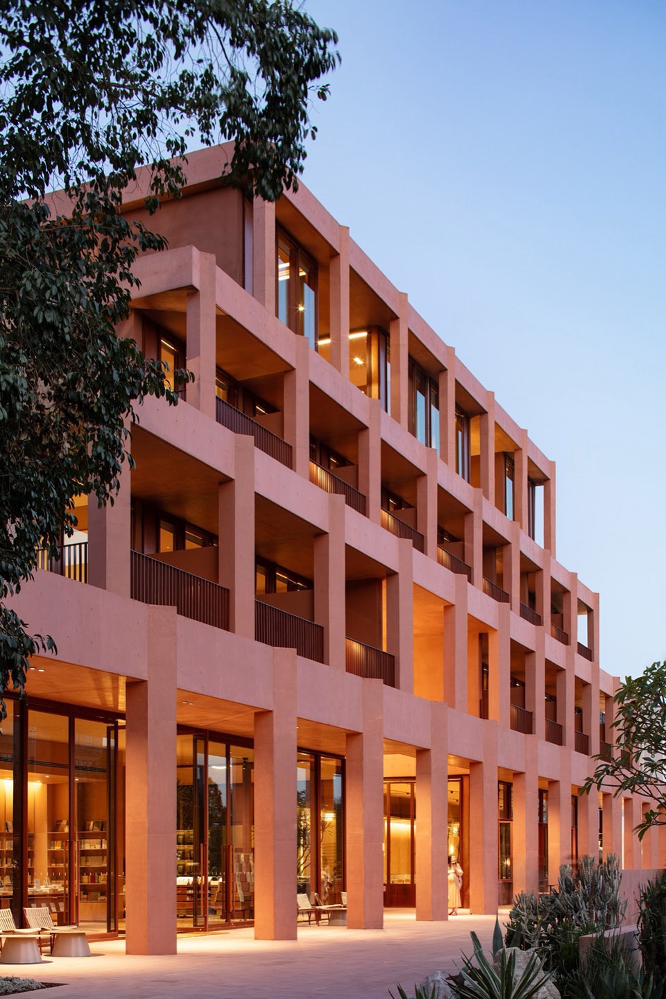 The interior atmosphere continues the building’s warm architectural language. The ground floor is organized into two spaces yet interconnected zones: a combined bookstore and hotel reception space, and a café with light dining. Rather than separating functions through fixed partitions, the public areas are conceived as a continuous and fluid spatial sequence, allowing movement to unfold freely and maximizing the inherent openness of the building.