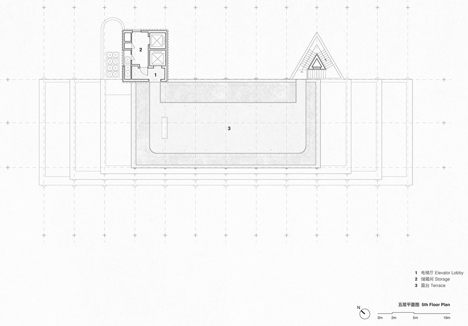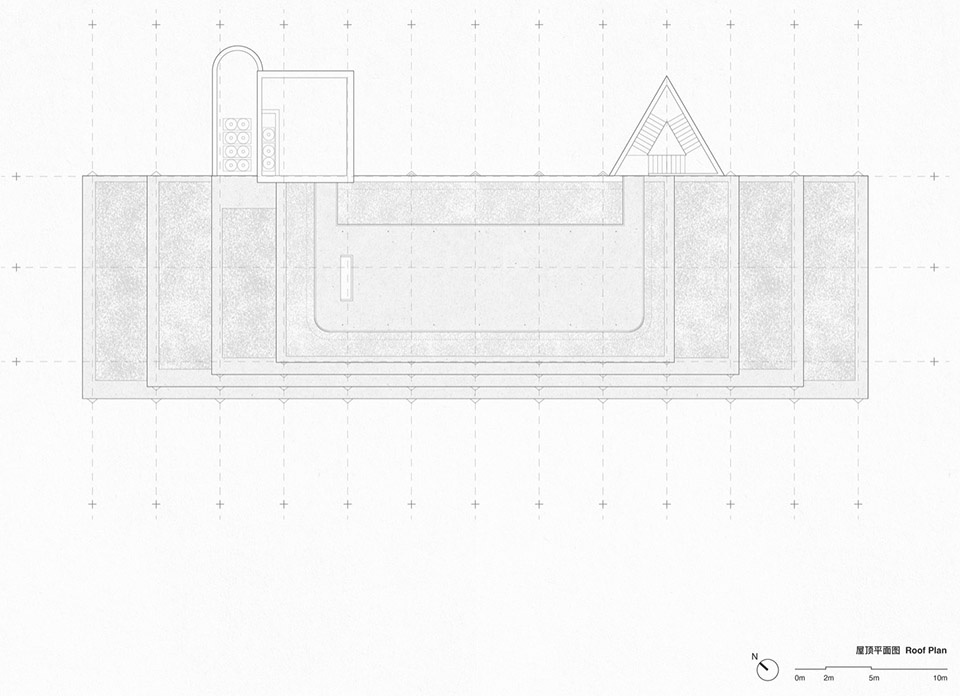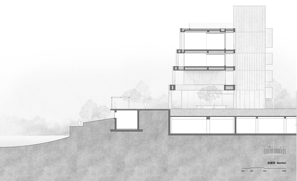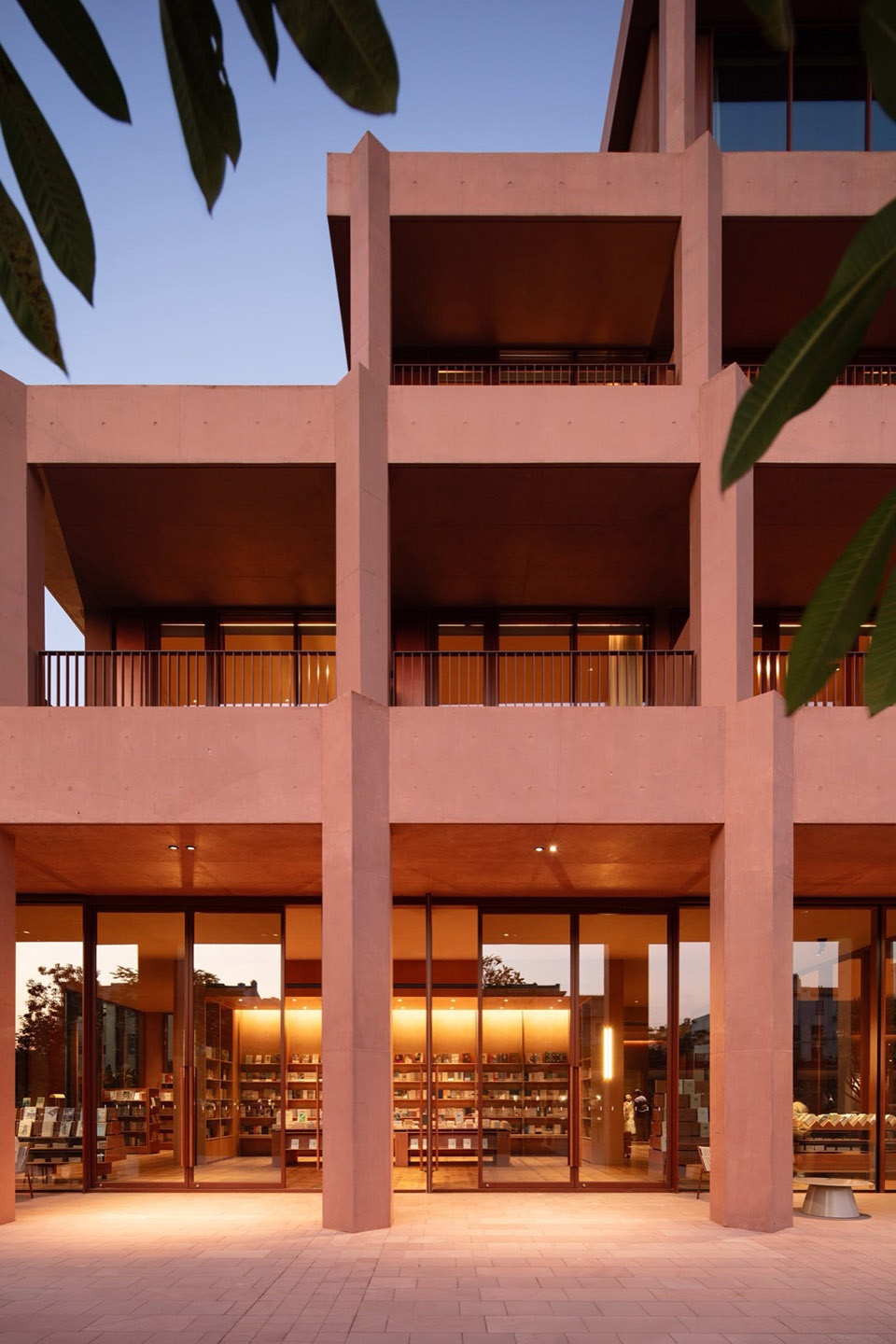 Within the symmetrical structure, two double-height semi-outdoor courtyards are introduced on the ground floor and the third floor to break the repetitive rhythm of the façade and to create subtle spaGal variations. These courtyards also bring daylight and greenery deep into the building, allowing the natural landscape to merge with the architecture continuously. The central atrium on the ground floor faces the riverfront viewing deck on one side and connects to the pedestrian street on the other. This configuration enables the building to embrace pedestrians from all directions with an inclusive attitude, reinforcing its public character. As a transitional space, the courtyard links the bookstore and restaurant through human movement, creating an uninterrupted and seamless spaGal experience between indoors and outdoors.