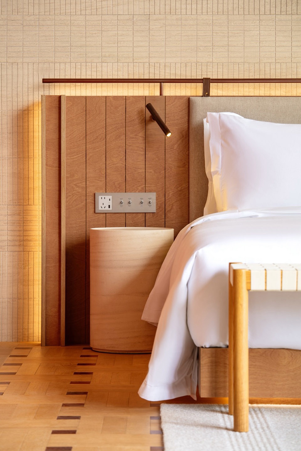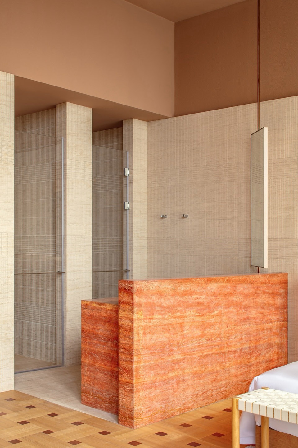 室内氛围也延续了建筑温暖的调性。首层分成两个通过中庭连接的独立室内区域,一侧空间集书店和酒店接待功能为一体,另一侧是简餐厅和咖啡厅。在公区设计中,我们没有设置隔墙将不同的功能硬性隔开,而是创造一个连续流动的动线,最大程度释放建筑空间本身开放的特质。二到四层的客房共18间,分为3种户型。 标准户型虽然室内面积不算大,但每个房间都有一个充满阳光的河景阳台,把生活放大和延伸。室内大使用了木纹石材、红色洞石、红色海洋板、混凝土砖、等暖色的材料, 天然材质温润的属性和带有暖意的色彩,让空间保持着亲和感和烟火气息。在局部的地面和墙面,我们设计了拼花木地板、拼花水磨石和马赛克石材砖,多种纹样的使用让人联想到广州的老式花砖,把广府的技艺和美学传统用现代的语言融入到空间细节之中。