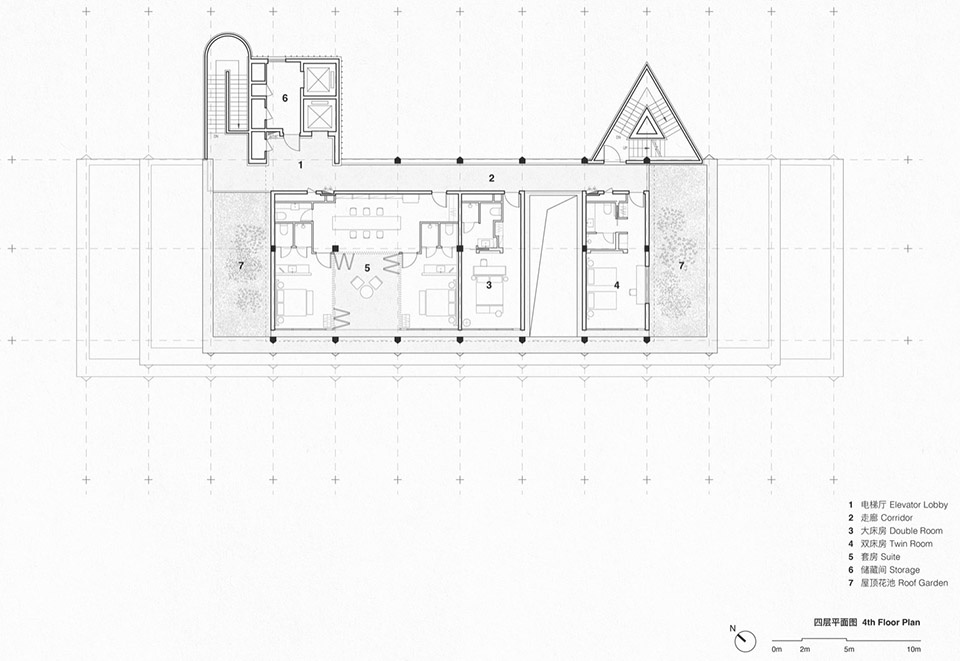 As a multi-functional space, author’s room Hotel adopts the spaGal sequence of ground-floor retail and upper- floor residence, recalling the traditional Qi Lou typology. The building is organized into four levels: the ground floor functions as a publicly accessible common space, accommodating a bookstore, café, and light dining, while Levels 2 to 4 are dedicated to hotel guest-rooms. The entire structure is articulated beneath a continuous colonnade, which mediates between interior spaces and the surrounding public realm. Rather than defining the façade with solid walls or any other hard edges, a series of polygonal columns establishes a semi-outdoor colonnade, blurring the boundary between inside and outside. The linear grid consists of the columns, beams, and slabs that play both roles of the visual language and the structural framework. By deliberately exposing the peripheral structural system, the design enables the external form to directly reflect the internal logic of construction, allowing structure, space, and appearance to converge into a coherent architectural language.