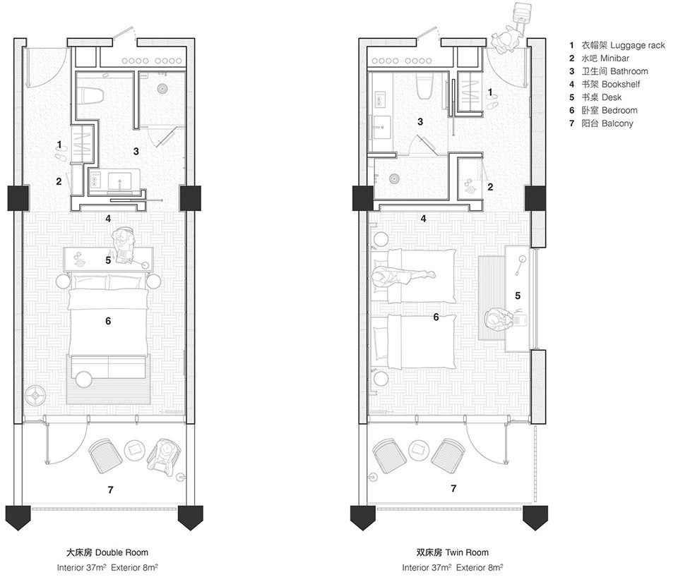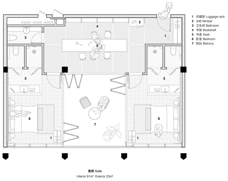 柱廊形成的虚实空间,打开了想象。廊下的空间是一片灵动的场域, 它邀请阳光、微风入内,包容四季的流转,形成温柔的开放性边界。人们多样的生活场景也在其中展开——首层商业空间的沿街面全部后退留出公共人行空间,过往的游人漫步廊下,自然的就穿行进入了书店和咖啡厅内部;上方的楼层在柱间分隔出18间面向河景的客房,檐下的露台让客人与河景直接对话,亲近自然。功能性上,柱廊作为建筑的第二层表皮,遮阳避雨,顺应了广州多变的天气,同时也一定程度的遮挡了河对岸视线,让客房获得足够的隐私。