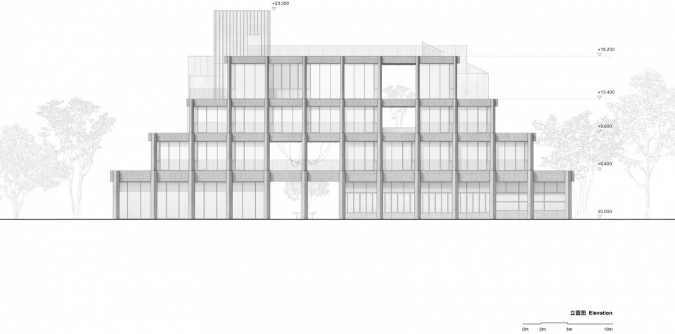建筑另一个突出的造型特点是退台式的设计。四层的建筑由四个堆叠的体块组成,随着楼层的增加,体积逐渐减小,形成富有力感的阶梯式造型。从各个角度看,它的轮廓都呈现出变化。作为地块中最靠近岸边的建筑,退台设计也一定程度的从视觉上消解了建筑体,形成更宜人的尺度感。