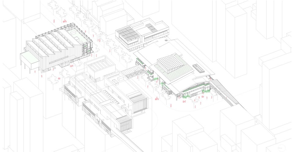 理想之地的城市设计以丰富的公共空间串联高度垂直混合的各种业态,营造“密度+浓缩”的上海市心生活体验。我们在建筑设计之初就充分回应城市设计的理念,将原本市集与体育中心所在的茂育路以北地块做了进一步的街道空间梳理。靠近合作路茂育路的十字路口设置街角广场,市集与住宅地块之间引入商业内街,内街转向茂育路的街角放大成节点空间,并通过体育中心的一层架空将街道延续至东侧街心草坪运动公园。街道如同城市的毛细血管般在地块中延伸渗透,消解封闭住区对公共空间的侵占,将公共空间最大限度地释放并归还给城市。在项目落地阶段,随着业主对文化中心的战略定位有所调整,将市集与其用地互换调到了路南,尽管如此,我们对地块内街巷结构的梳理,仍然被保留了下来。