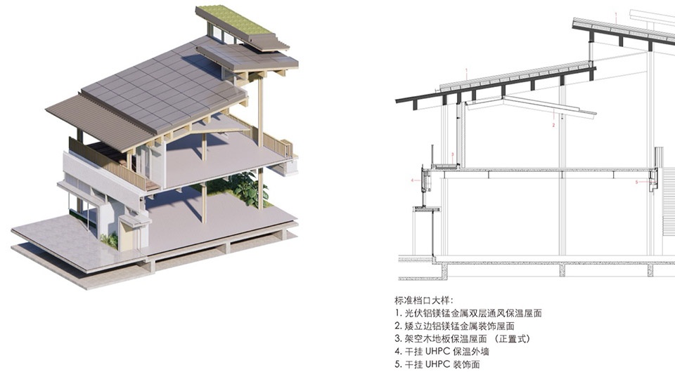 装配式的设计理念也延伸到外立面和屋顶的材料选择及设计。立面主要材料为玻璃排窗及UHPC干挂系统、单元式钢木组合栏杆,屋面采用铝镁锰板叠加光伏组件,局部设置不锈钢坡屋面绿化种植格。设计前期对精确的网格模数的控制,在后期的实施中体现出其优势和潜力。立面及屋顶轮廓均被控制在一张隐形的网格模数内,这一网格模数有利于外墙材料、金属栏杆、屋顶光伏板及屋顶绿化种植格的标准化加工,减少非标构件数量。