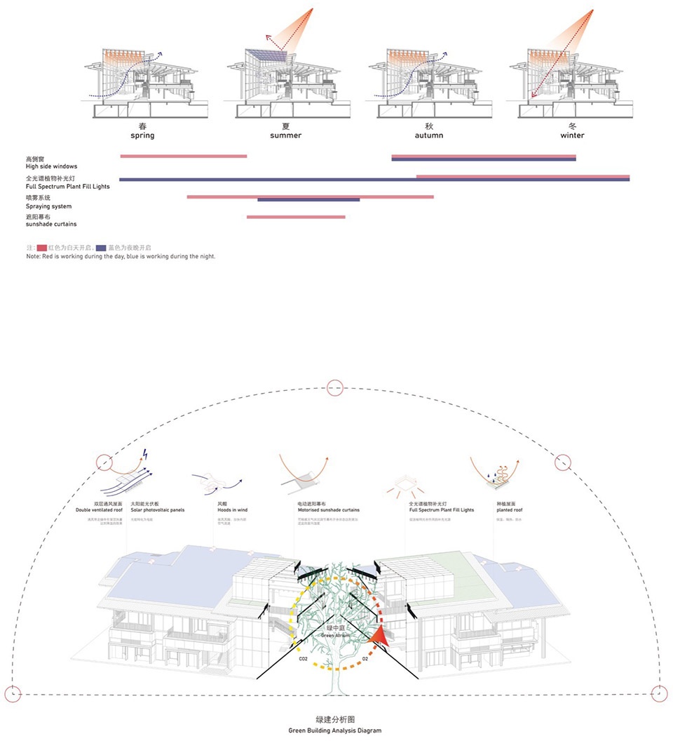 我们与业主、低碳顾问以及绿植顾问等多团队共同研究,在绿中庭的空间体验之外,更对人与植物共存的微环境调控进行了深入设计。我们根据上海地处夏热冬冷地区的不同季候特征来调控室内植物所需的日照、通风、及温湿度。春秋季非空调时节,我们所要做的就是加强室内外的气候联通,打开中庭高侧窗及一层低位的换气窗,利用拔风效应,提高室内通风率;收起顶面遮阳,为室内中庭加入充足采光。我们在玻璃幕墙内侧设计了可升降多层金属夹心保温隔热板,升起时悬挂在屋檐下;通过机械装置降下时互相搭接成一层保温墙体,并与玻璃幕墙间留有空气间层,形成类双层的可调节幕墙。夏季白天气温高于26℃时需关闭外窗,展开屋顶遮阳,加强室内温湿度控制;在中庭内补充喷雾以增加湿度;降下幕墙内侧保温隔热板,打开中庭高侧扇,形成通风隔热层带走表面热量。冬季当气温低于18℃时,需关闭外窗,收起屋顶遮阳,让更多的太阳辐射热进入,保持室内温度;降下幕墙内侧保温板形成密闭空腔,保存室内热量;开启中庭顶部的热回收装置将热空气输送至低位,增加室内近人高度的舒适度。然而在项目落地时,由于升降保温板的机械装置研发生产难以在市集建造周期内完成,双层可调节幕墙最终遗憾并未实施。