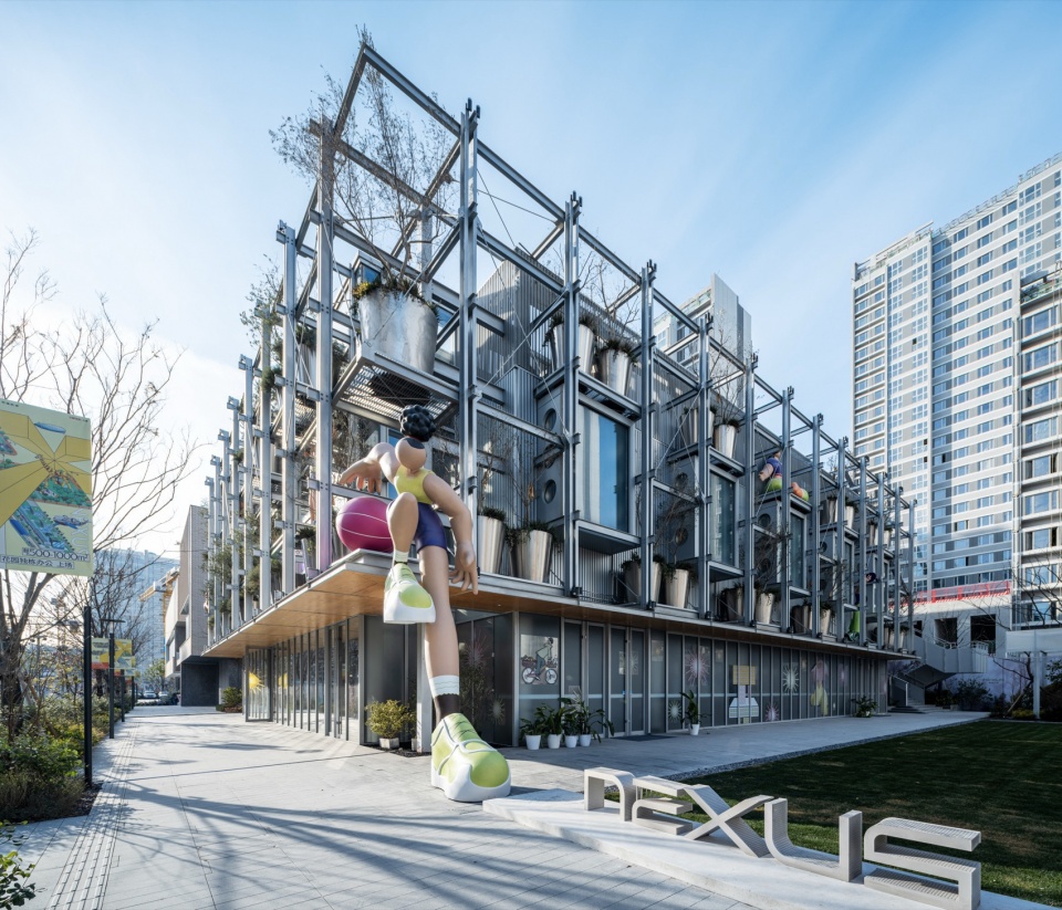 Steel frameworks with tree planting pools are suspended outside the glass curtain wall of the lobby and extend northward along the east façade, forming a large-scale vertical green installation facing both the street and the sports lawn, delivering a strong visual statement. The steel frameworks project outward from the main concrete columns,and each cantilever assembly consists of six horizontal beams layered vertically and topped with tension cables. Vertical U-steels are clamped in pairs atop the I-beam cantilevers. Between each set of cantilever assemblies, lattice steel plate platforms are arranged in staggered intervals both in horizontal and vertical directions, and the upper and lower platforms are kept at twice the height of the cantilever beam spacing. Each platform is placed with a pair of olive trees equipped with stainless steel planting pools. Additionally, prominent platforms host a series of large, colorful cartoon-style sculptures representing various sports themes. The entire suspended frameworks gain overall stability from a network of crossing tension cables arranged within the horizontal plane beneath the platforms and the vertical plane of the façade. Crafted from finely detailed steel, the framework structure showcases exquisite industrial craftsmanship and technological finesse.