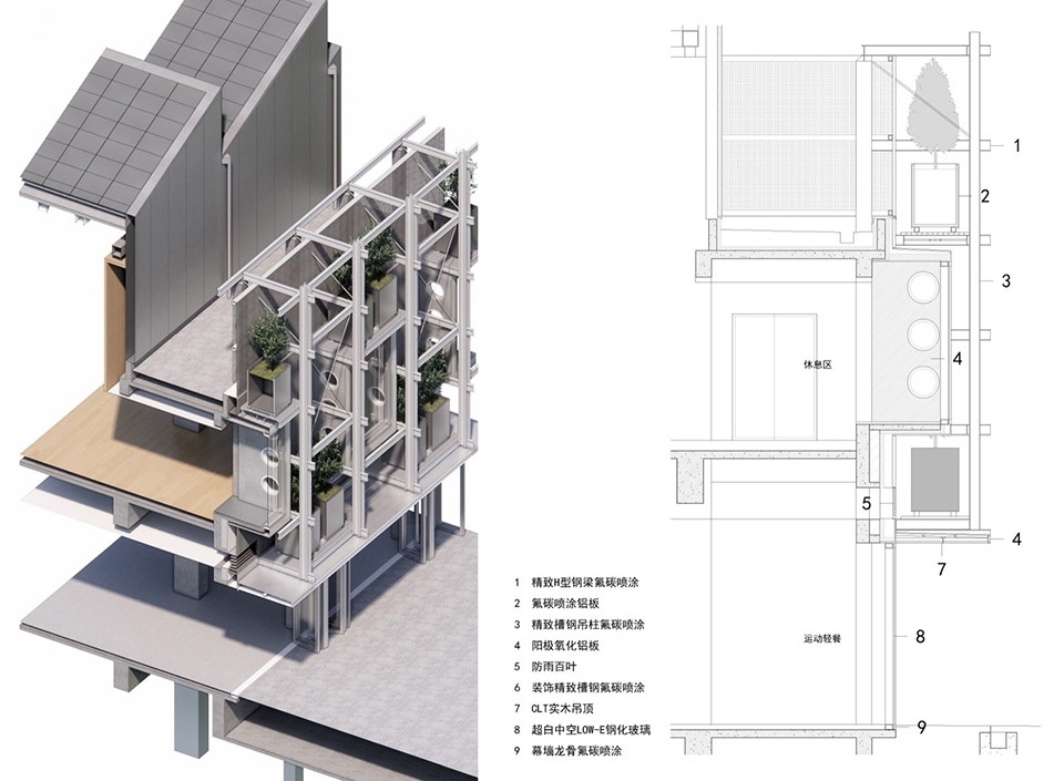 门厅的玻璃幕墙外悬挂钢构架搁置乔木种植池,并沿东立面向北延伸,形成面街和面运动草坪的大尺度垂直绿化装置,给人强烈的视觉提示。构架从主体混凝土结构柱挑出,每一榀出挑构件由6层水平挑梁及顶部拉索构成,竖向的槽钢两两相夹在工字钢挑梁上,每榀出挑构件之间左右上下间隔错位布置双层挑梁间隔高度的格构钢板平台,每个平台上搁置一对配有不锈钢种植池的油橄榄树。另在位置醒目的平台上安置数组大型运动主体彩色卡通塑像。整个悬挂构架利用平台下水平面内和立面竖平面内间隔布置的交叉拉索提高其整体稳定性。立面构架采用精致钢制作,构造细节完美,展现出精湛的工业技术感。