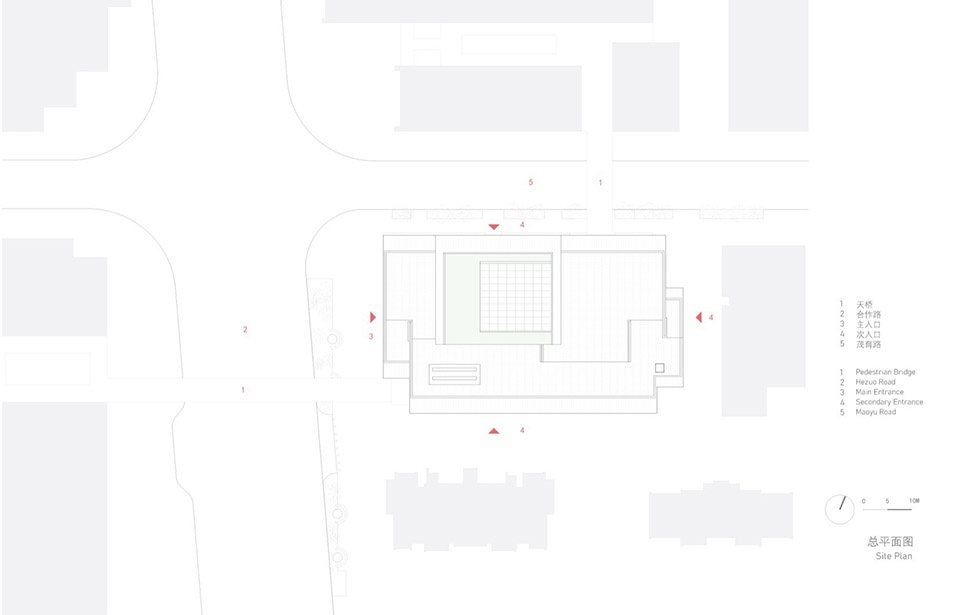 On the first floor, ten mixed-use shops, along with four dining establishments on the second floor, are arranged on three sides around a two-story-high, north-facing green atrium. The main entrance faces the western street plaza, while secondary entrances on the east and south sides open onto inner streets. These secondary entrances are connected through the atrium by an L-shaped indoor lane, which is highlighted by two small double-height side atriums.