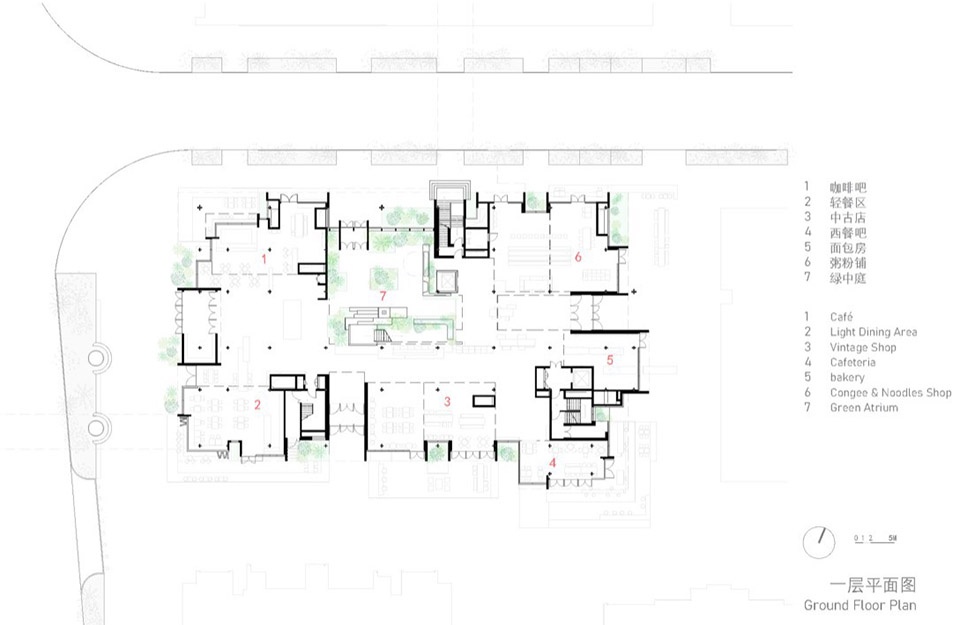 一层的十个综合店铺和二层的四个餐饮店铺都三面围绕朝北面街的两层通高绿中庭布置,主入口面向西侧街口广场,而东、南两侧面向内街的次入口之间以一条L形室内小街穿越中庭联通,并配以二层挑空的小边中庭将该小街提示出来。