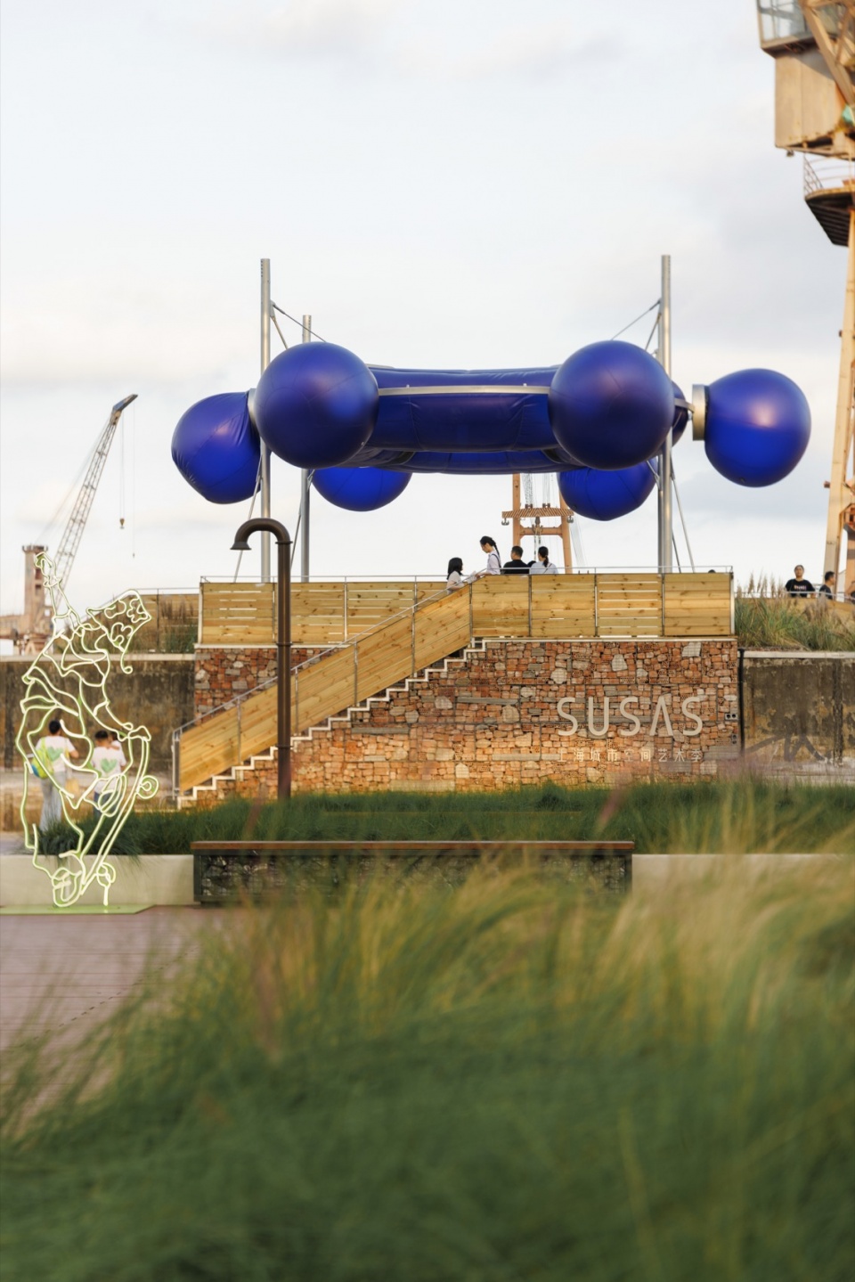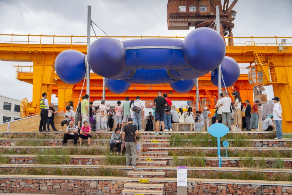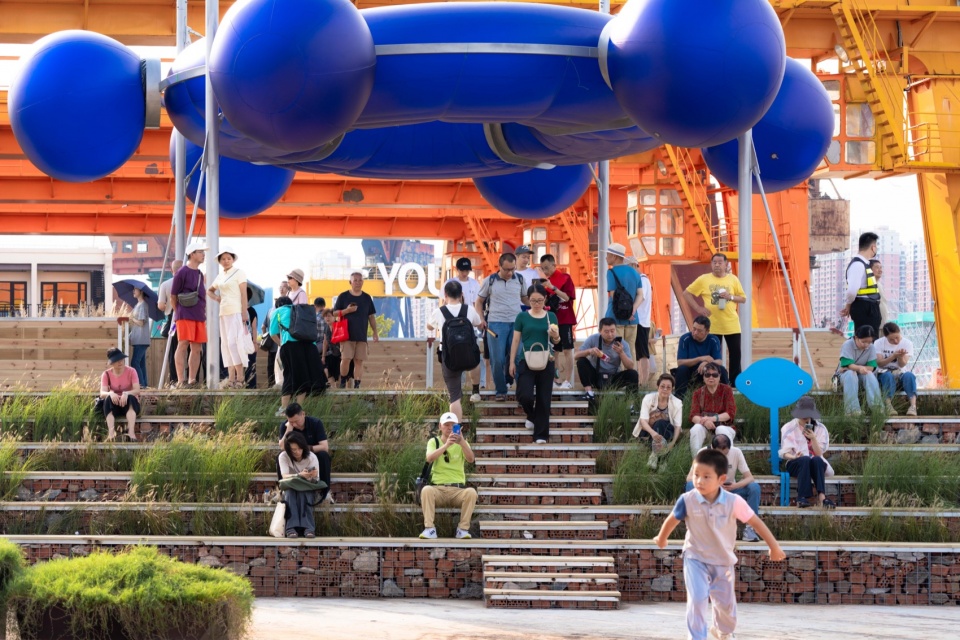 装置两侧通过两段性质迥异的阶梯与场地相连:园区一侧刻意营造出最日常的楼梯形象,暗示观众这里是可通行、可登高的区域,引导人流跨越防汛墙并进入滨水空间;码头一侧则被处理为更具停留属性的高台与滨水景观阶梯,成为人们登高望远的观景台——望江台;阶梯上间或布置绿植,营造惬意的临时休憩空间,并在活动发生时转化为回望的驻足点。