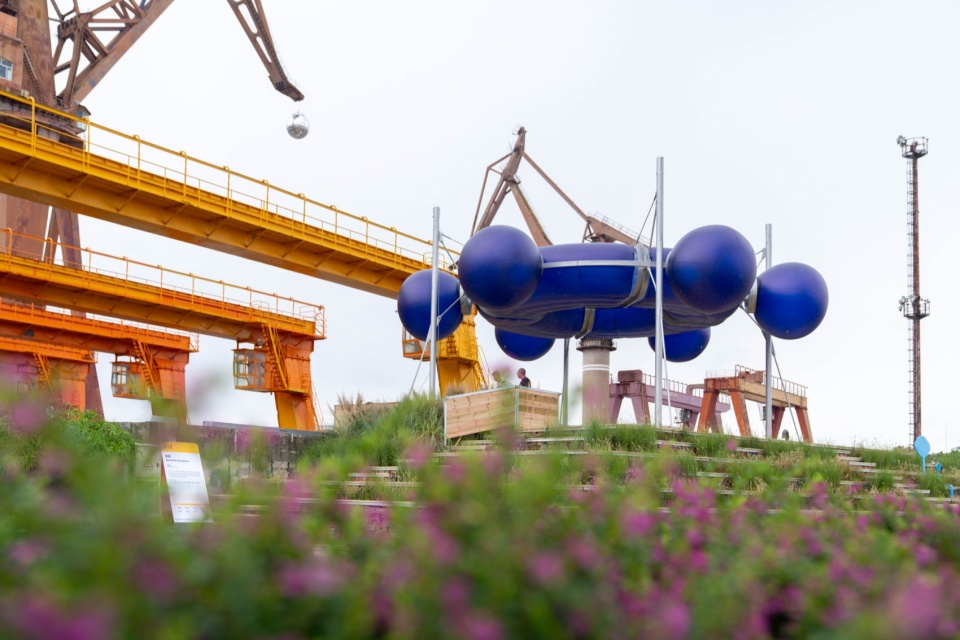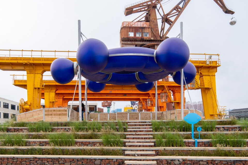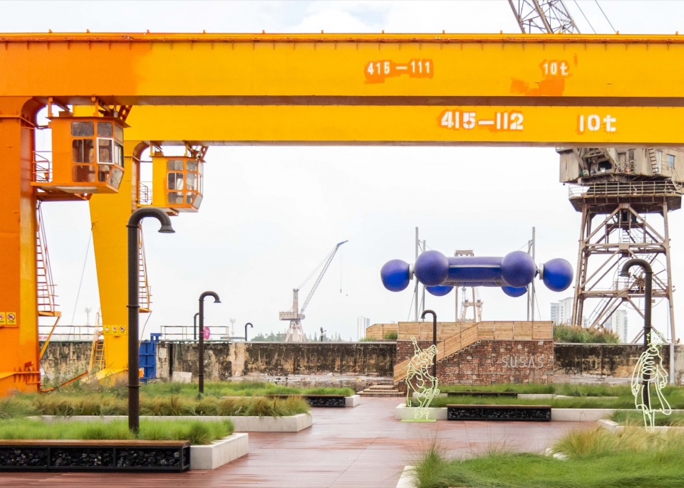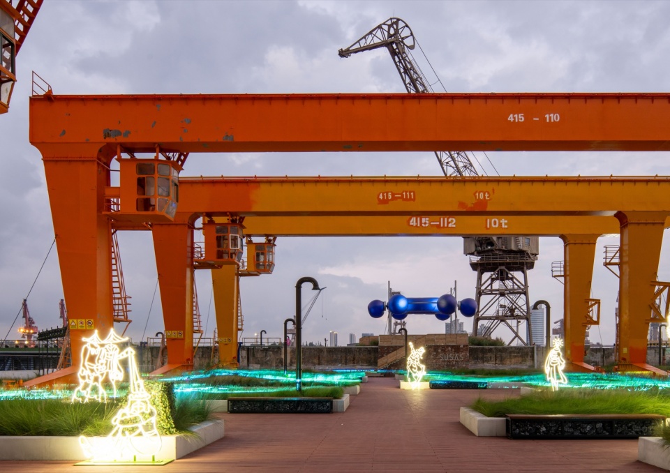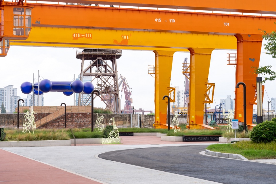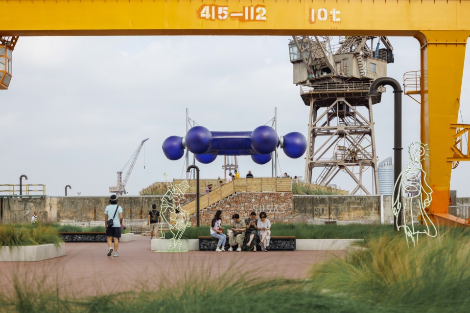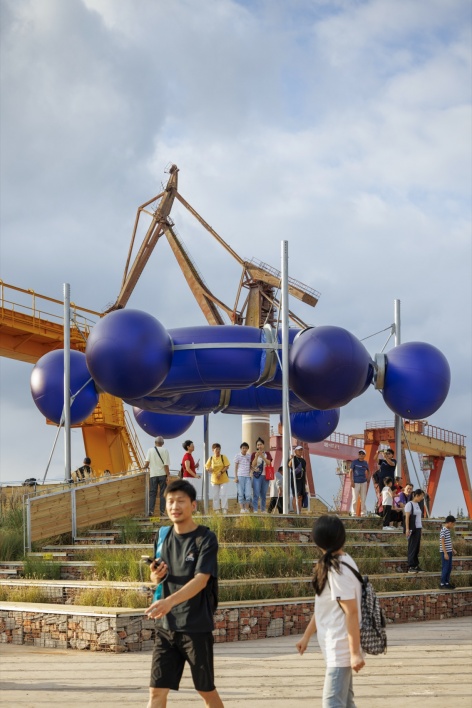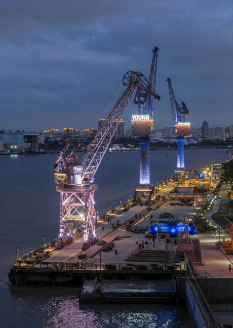 The main venue for the Shanghai Urban Space Art Season 2025 is Fuxing Island Shipyard Park, which was once the site of the Zhonghua Shipyard. Within the area, numerous industrial remnants are visible: cranes of massive scale, shipway ruins, factory building ruins, and more. The waterfront space of the main exhibition area – the elevated pile wharf – was also originally a shipbuilding site. Its elongated length-to-width ratio resembles the shape of a ship, leading us to initially perceive the entire wharf as a floating vessel. The northern end of the site, where the project“Quantum Navigator” is installed, naturally becomes a pivotal “position” for overlooking the surroundings and steering the course.