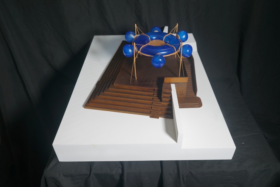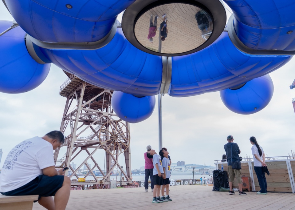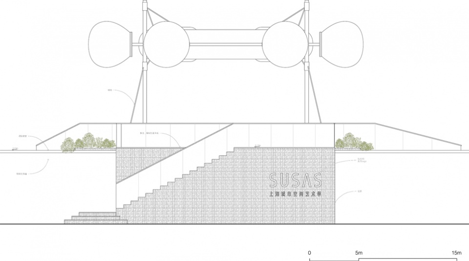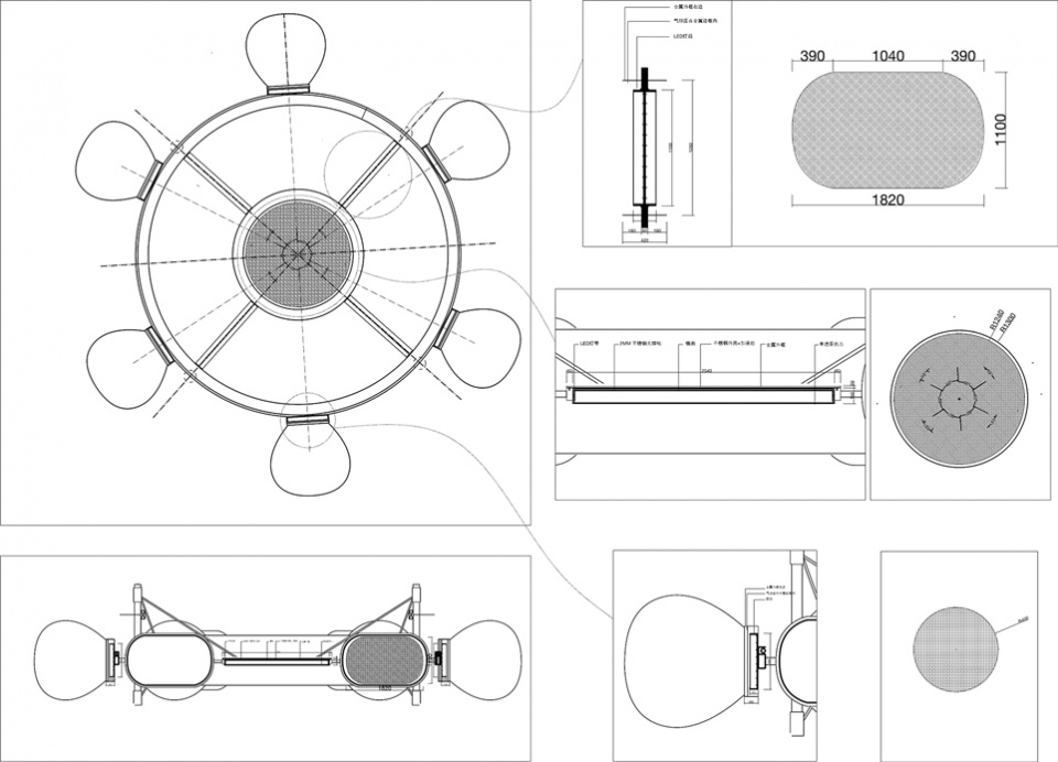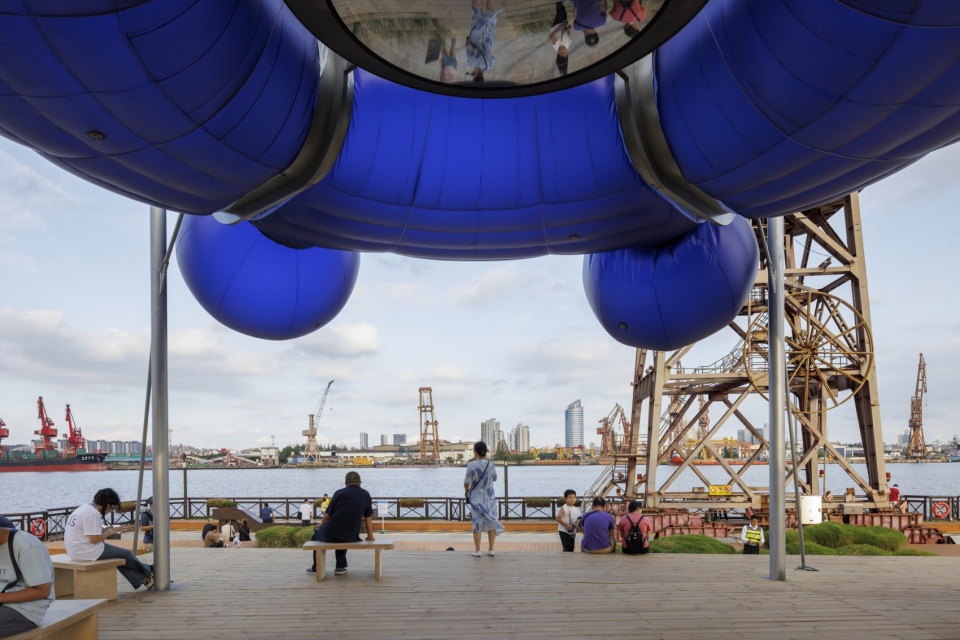 “航舵”“远航”或“归航”意象,不仅指向空间形态(顶部的气膜),更想呼唤出当代都市生活中的心理声音:平台上开阔的视野中,存在如此纷繁的方向(航向),你该做何抉择?东方卫视的记者描述顶部灯光装置有“未来”的意向,由现场废料构造的底部基座有“过去”的意向。“未来”建立在“过去”之上,人在“之间(in-between)”便获得了一个“现-在(在现在存在)”的位置。我们特意在顶部装置的中央设置了一面圆形的镜面,抬头仰望“未来”,我们看到的会是镜面中的自己。经历完不止不休的人生决断与代价后,远航归来疲惫的人类最原始的欲望——其实仅仅是在熟悉的野草阶梯上,安静地坐一会儿。