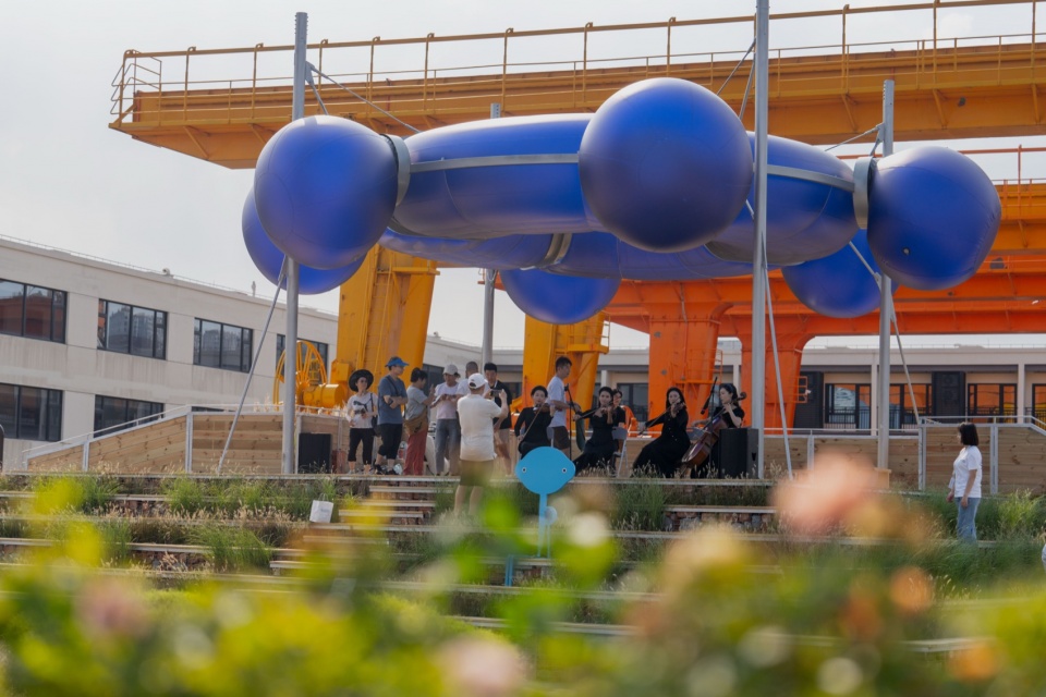 我们希望《航舵》装置是一个阶梯聚场,它期盼着游客在平台上聚集,并且可以举办不同类型的小型活动:迄今为止,已经举办过小型音乐会、观鸟活动、诗歌社群的集会等,游客也会在阶梯上安静的坐下,观看江水、明月——它其实是一个在建筑类型学上变异了的剧场,观众的视线不再被空间的设计安排聚焦于舞台的中央,而是通过滨水阶梯,将观众的视线离散于周遭,这是一种“去中心化”的剧场类型的尝试,我们只需切身想象,便能感觉到这样的设置其实十分符合人类的本能。据我在现场观察,面朝江水安静的坐在野草间、听着背后弦乐演奏的观众,是十分享受的。