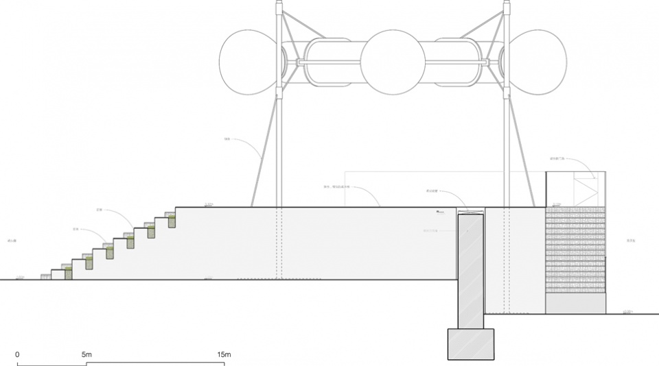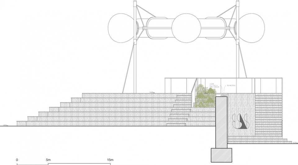 平台上方设置了一组直径约 11 米 的环形气膜结构,内设与气候互动的声光演出系统,为日常活动及专业演出提供特定舞美背景。气膜结构由平台四角的轻质杆件与拉索共同锁定,石笼则作为钢结构的配重起到一体化的结构作用,形成稳定而清晰的受力体系。在巨大的工业尺度环境中,半透明的膜结构以一种清晰的方式出现,在平台上方形成一个柔软而坚定的标识,成为游客进入滨水空间时的重要视觉指引。