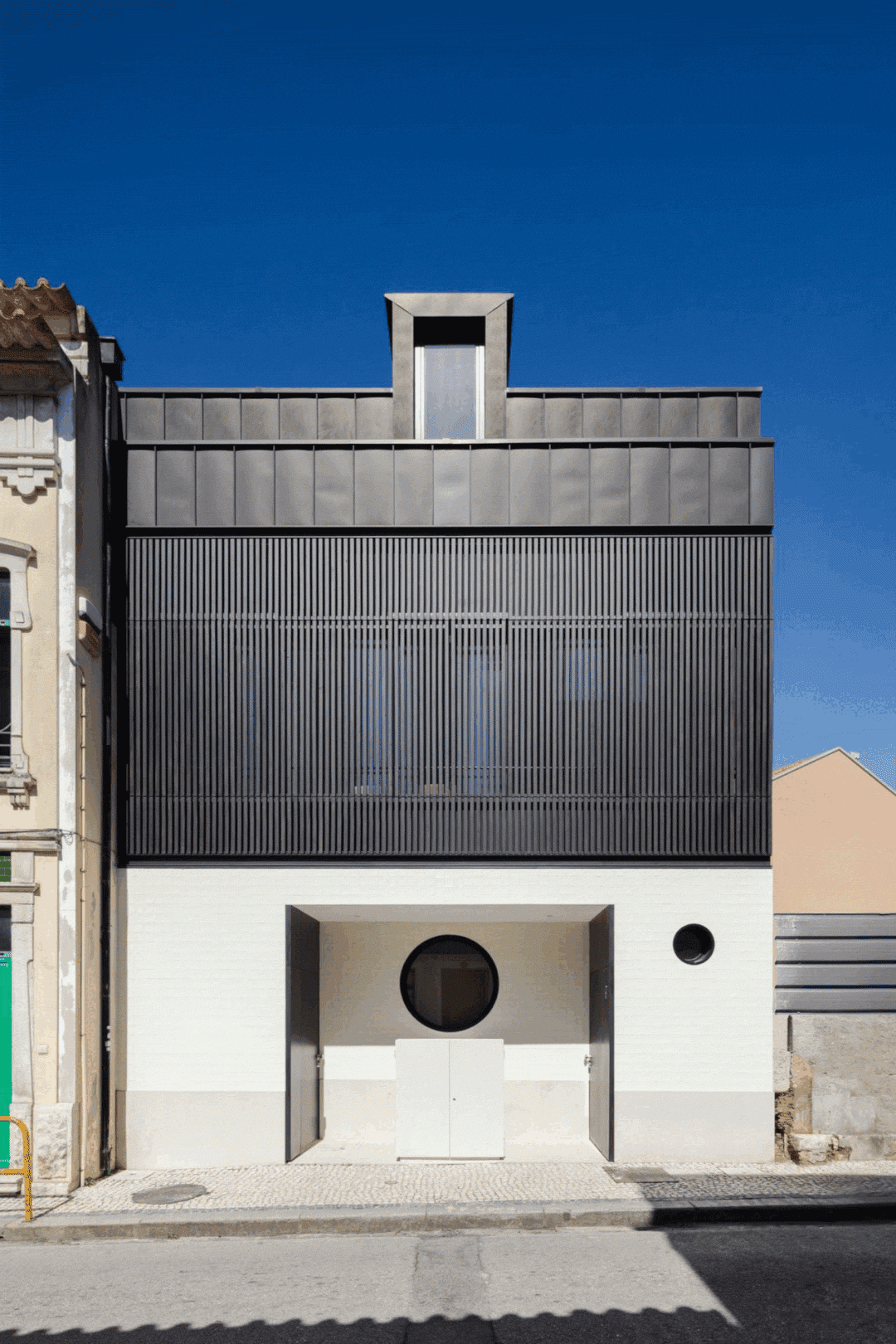 新建筑保留了两层、三开间与中央阁楼窗的熟悉结构,并配置了一个后侧上层露台庭院——这一布局在街道及整座城市中都十分常见。出于克制的姿态,新体量略微后退于街道红线,仿佛在“倾听”之后才开口回应。正是在这种谨慎而自觉的姿态中,建筑建立起一种审慎的对话关系:新建筑延续既有遗产,却并不试图盖过它。位于巨大圆形窗下方的技术壁龛,呼应了席尔瓦·罗查住宅中信箱上方那扇标志性的圆窗。