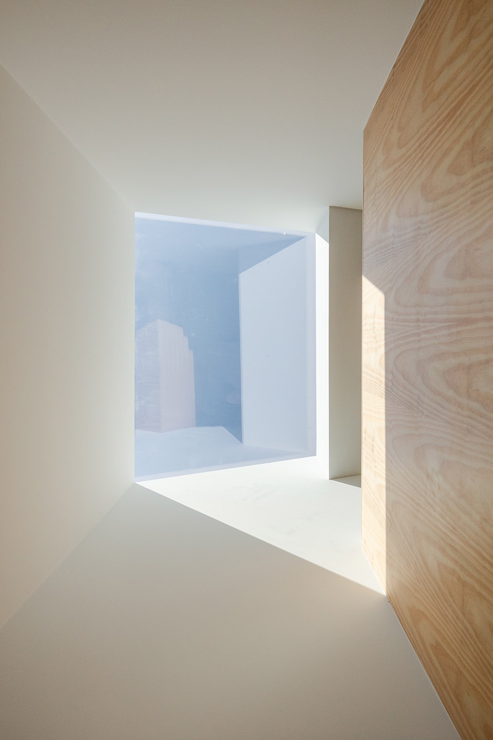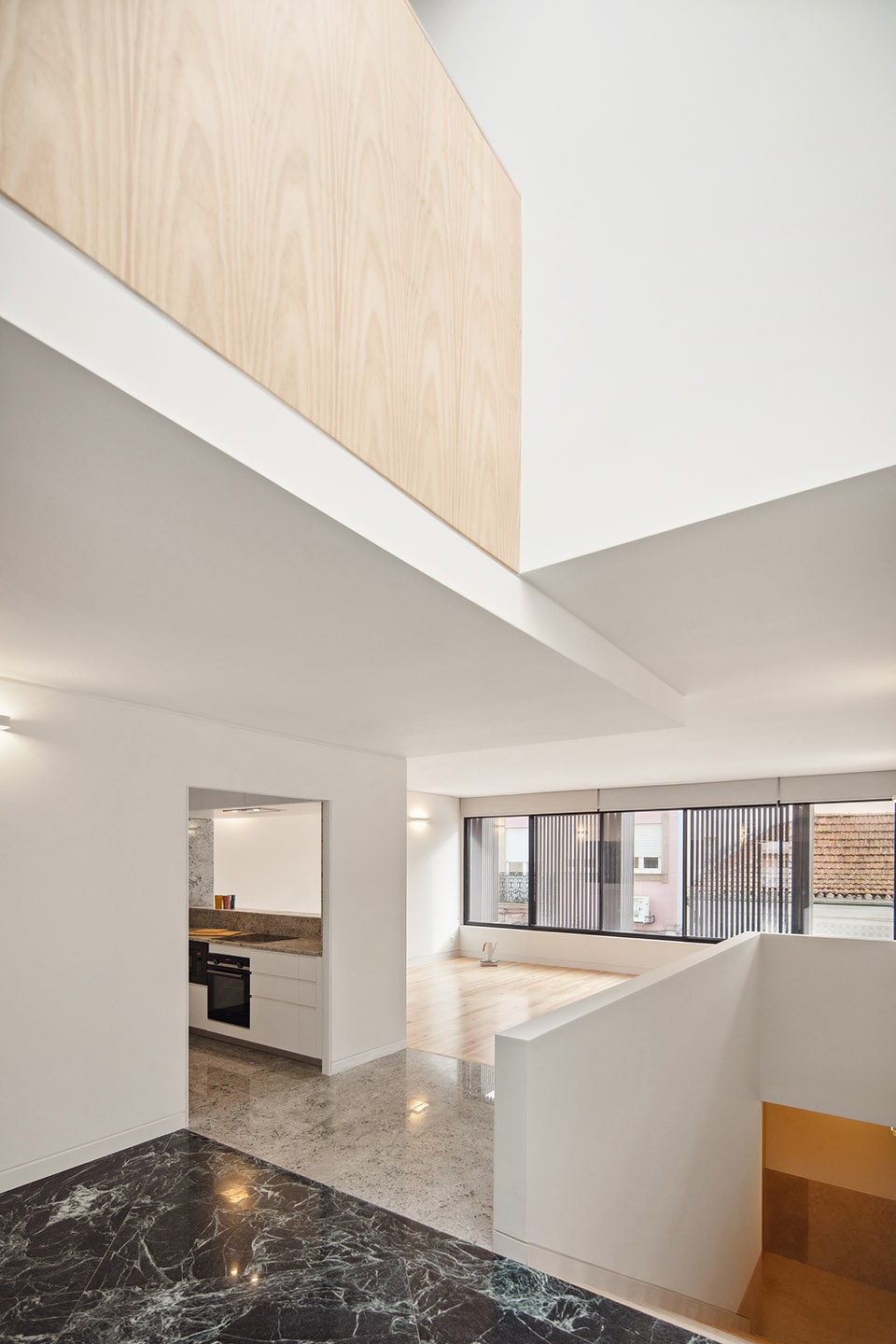 在上层住宅中,一处贯穿两层的中央天窗化解了狭深基地带来的采光问题。其轴线与入口前厅对齐,标示着抵达的瞬间,并以一种既直接又柔和、几近舞台化的光线,照亮两条垂直交通空间。公共起居空间朝南布置,面向街道,并通过木质格栅过滤自然光线;主卧套间则退居安静而私密的后立面。上层设置了两间卧室,分别位于建筑两端(一间利用主立面顶部的中央窗,另一间则通向抬高的后露台),技术空间、交通与书房夹置其间。