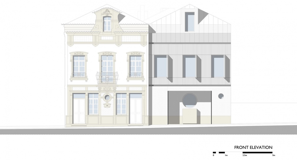 从类型学角度看,这座立面遵循了城市中反复出现的一种模式:由三条竖向开间组织的两层立面,上方以居中的阁楼窗收束。正是在与这栋建筑的直接对话中,萨宅(Sá Townhouse)逐渐成形。项目位于一块空置地块之上,在体量、材料与构图上延续了席尔瓦·罗查住宅的建筑语汇:立面的竖向与横向节奏、檐口高度的对齐、屋顶的几何形态,以及五段式的立面组织方式。