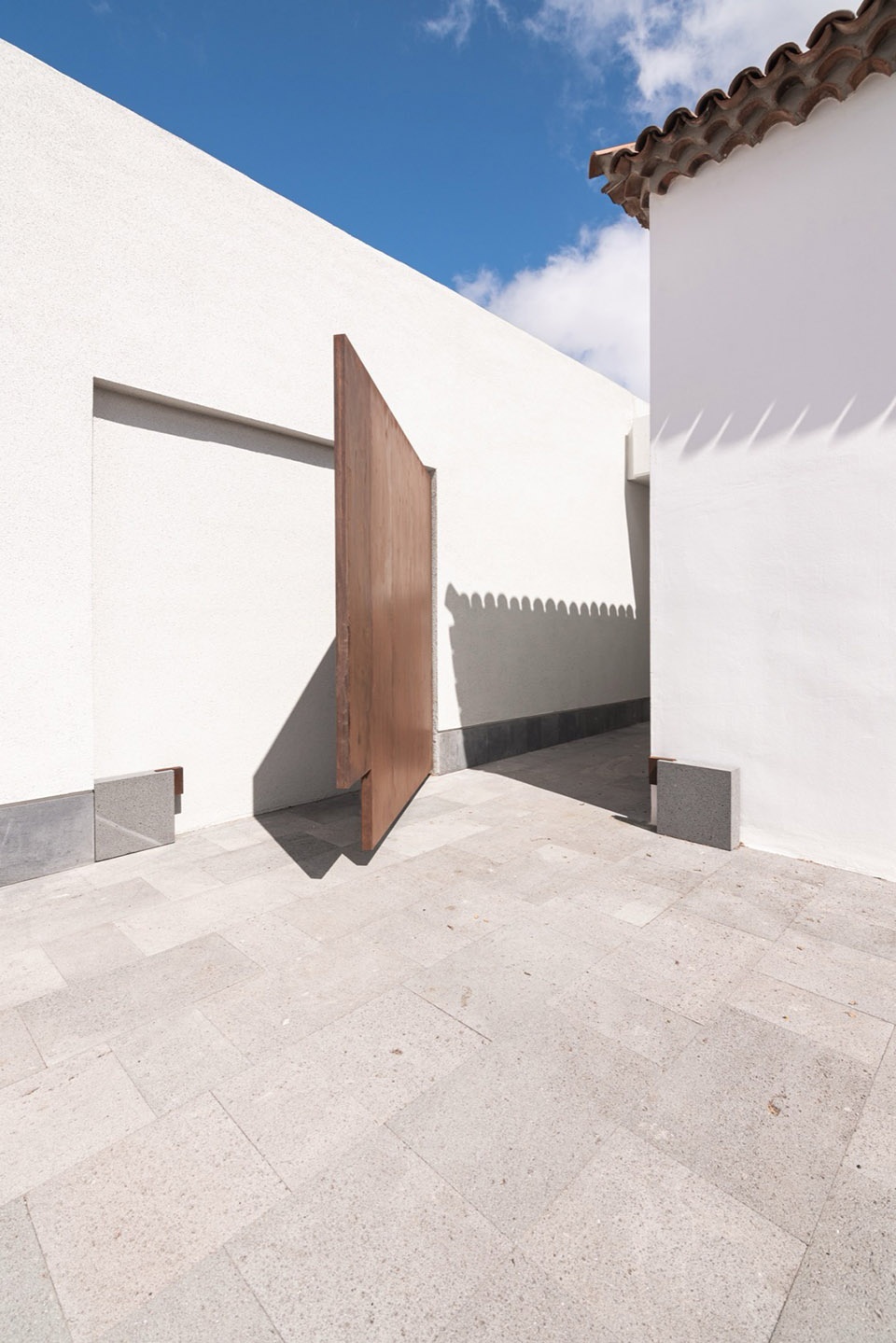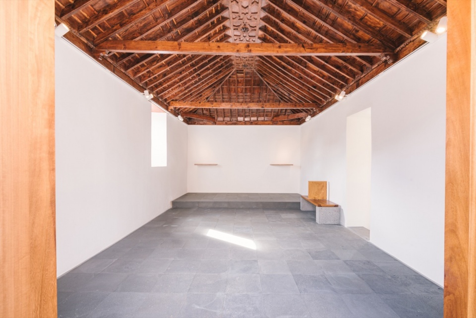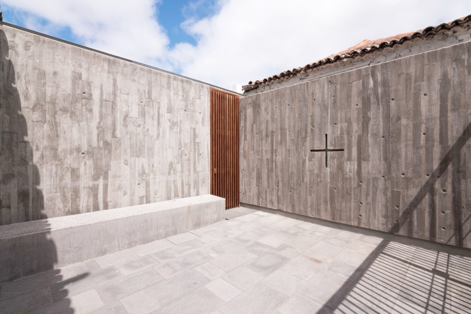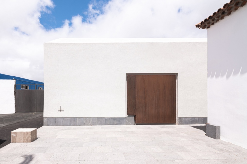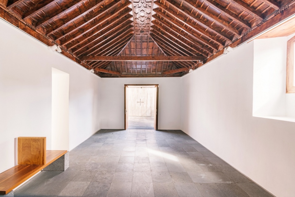 原有的小教堂建于18世纪初,沿旧日通往坎德拉里亚的道路而设,其建筑形态质朴而克制,与农业生产周期以及对当地居民和旅人的精神关怀密切相关。平面呈矩形,屋顶采用典型的穆德哈尔式 par y nudillo 木构体系,是加那利群岛乡村宗教建筑的重要范例。此次介入对这一历史体量进行了完整修复,遵循最小干预原则,以传统工艺重现木质藻井屋顶,同时清除20世纪以来扭曲其类型学解读的附加构筑,包括曾被封闭的入口前庭。