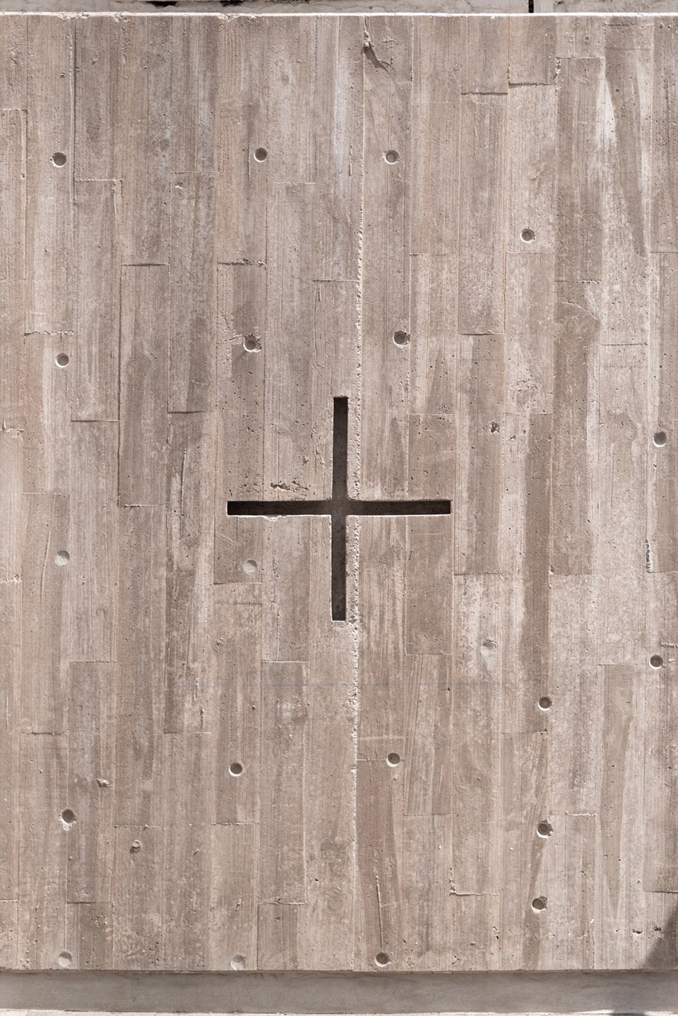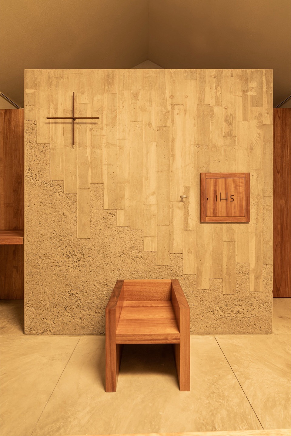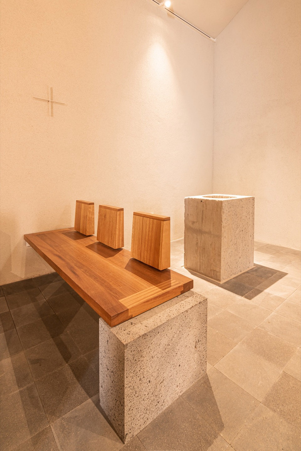 One of the most significant gestures of the project emerged from a conflict during construction. A reinforced concrete wall, built to protect the courtyard from road traffic, was demolished following an administrative controversy. Rather than discarding its material memory, the wall was cut into sections and reused to form the altar, the ambo and the baptismal font. The reinforcing steel contained within the wall was also recovered and used to construct the cross of the reredos. The material, broken and fragmented, thus acquires a sacramental condition, occupying the centre of the liturgy.