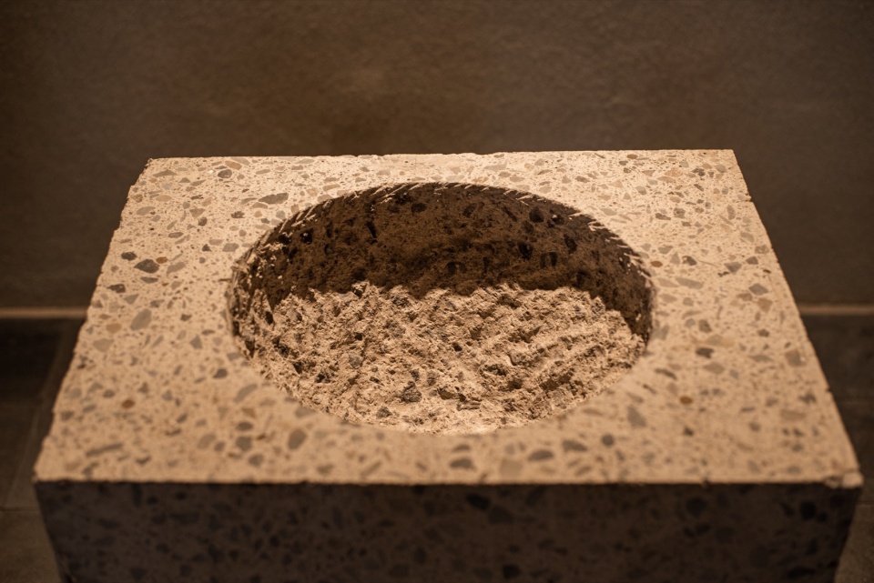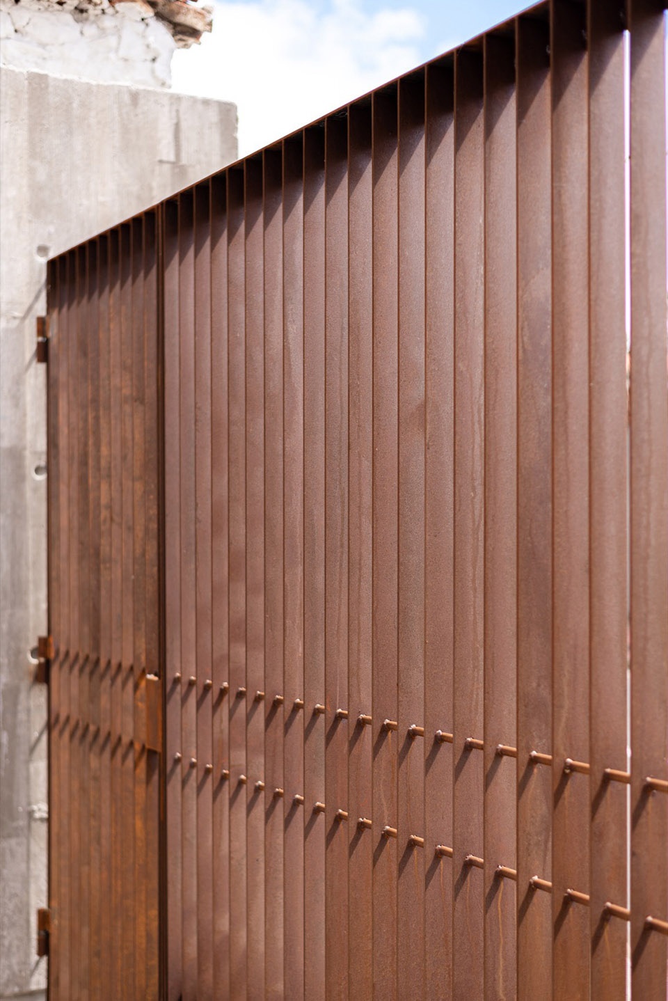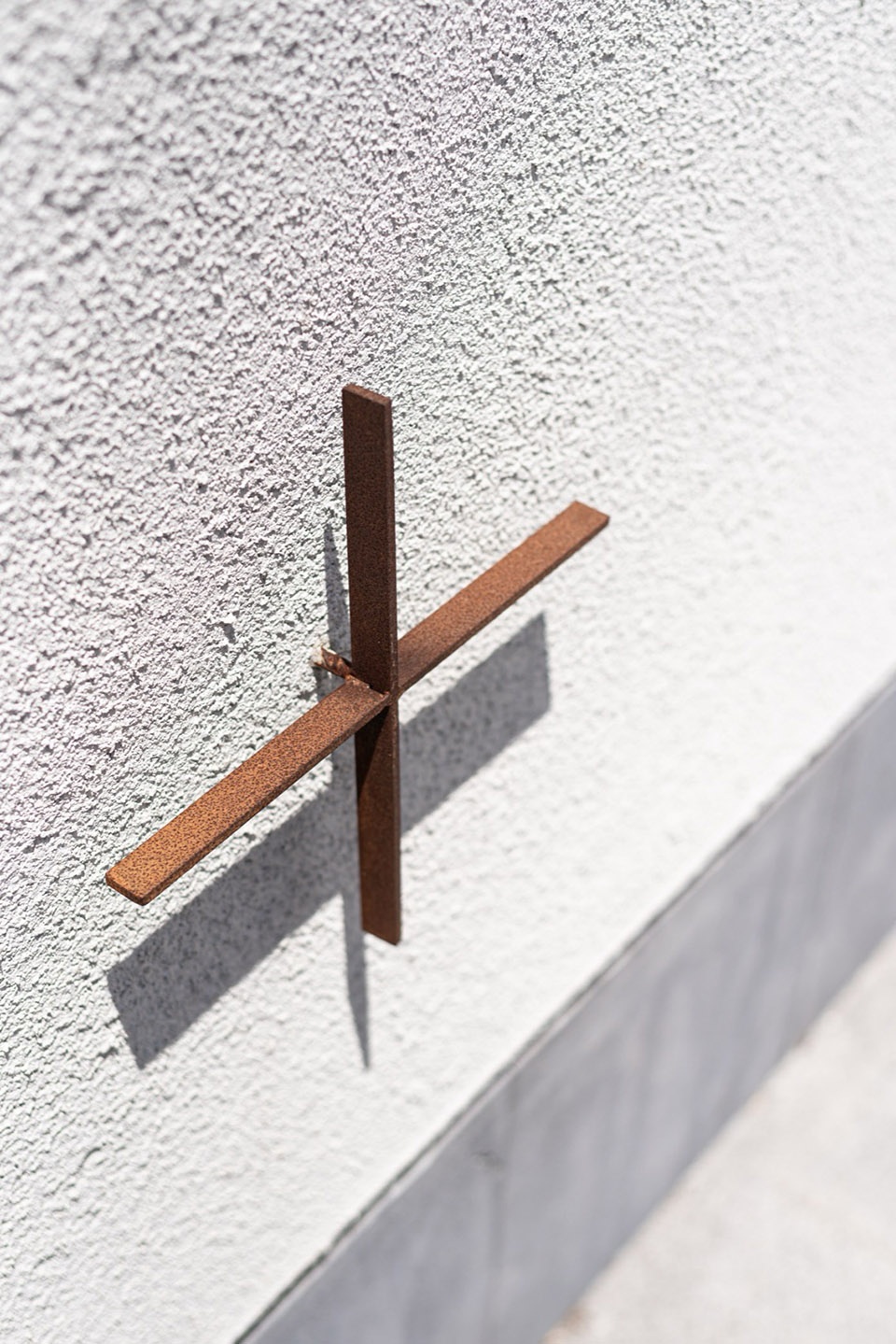 One of the most significant gestures of the project emerged from a conflict during construction. A reinforced concrete wall, built to protect the courtyard from road traffic, was demolished following an administrative controversy. Rather than discarding its material memory, the wall was cut into sections and reused to form the altar, the ambo and the baptismal font. The reinforcing steel contained within the wall was also recovered and used to construct the cross of the reredos. The material, broken and fragmented, thus acquires a sacramental condition, occupying the centre of the liturgy.