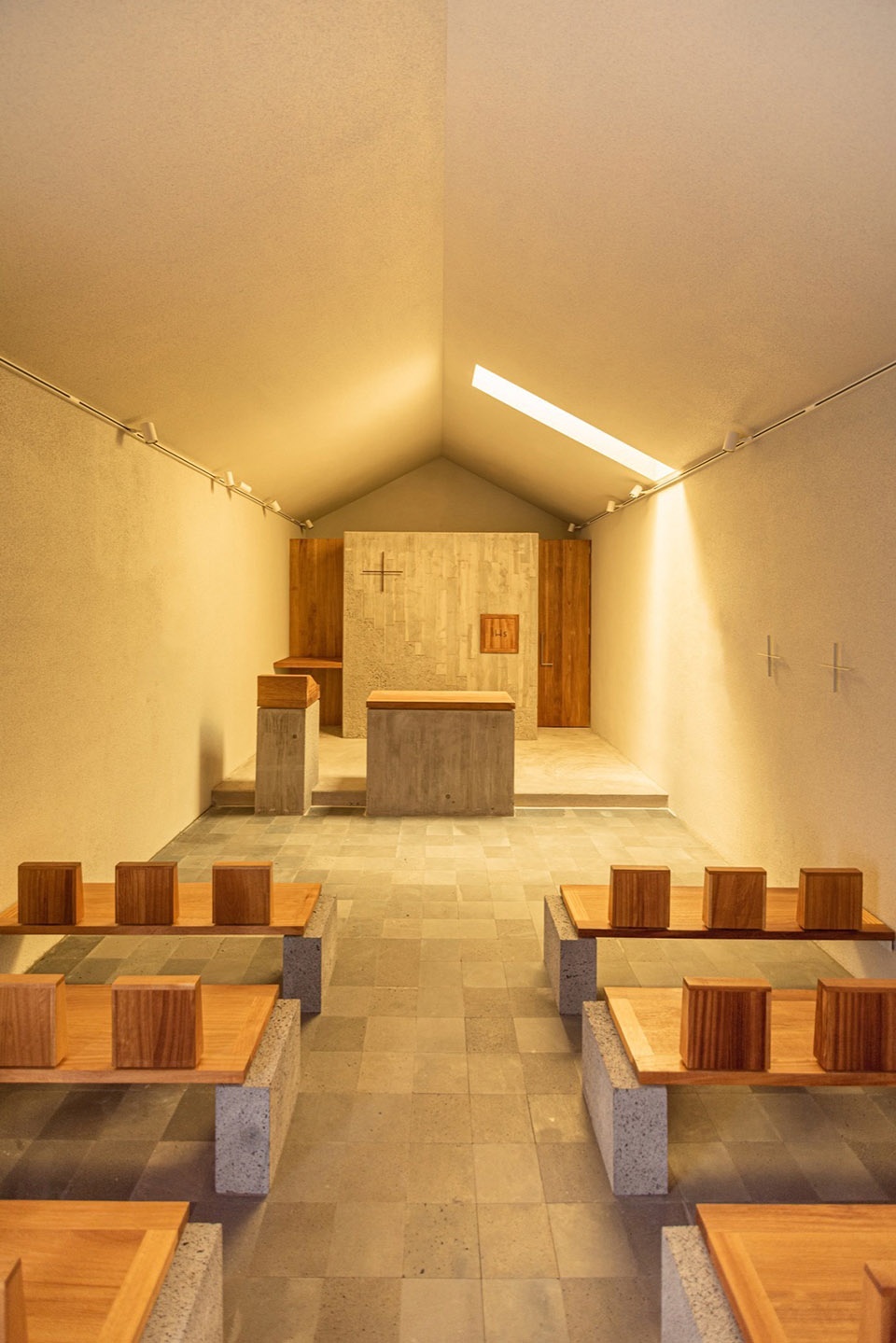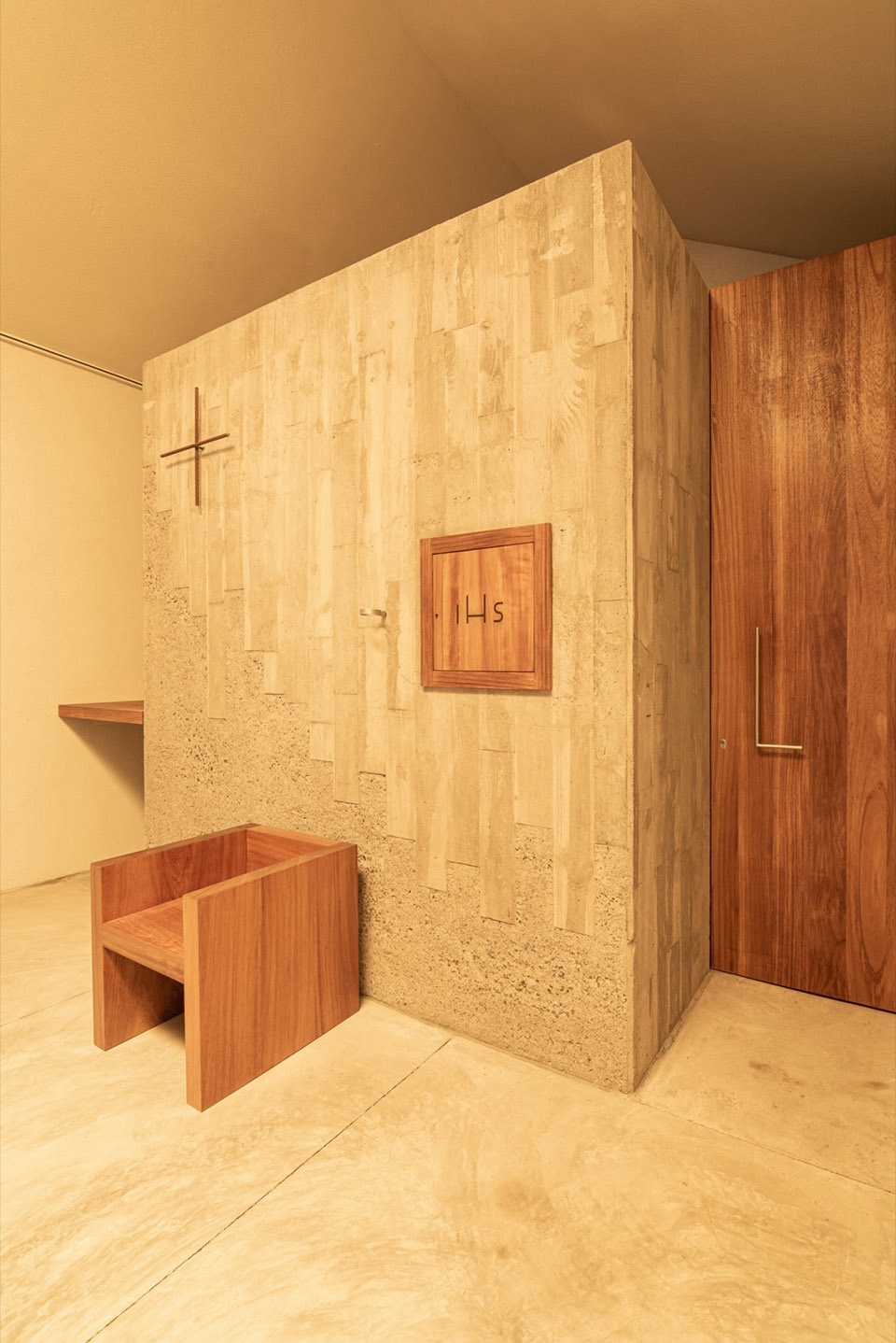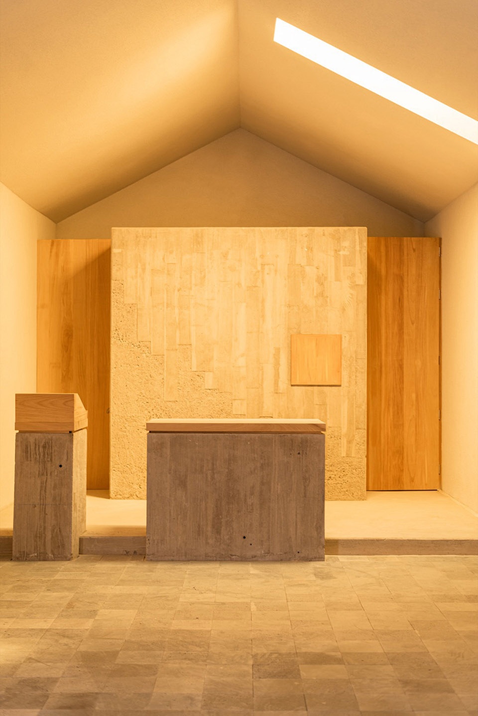 The new volume is built through a deliberately restrained material approach. The nave is resolved with block masonry walls, clad both internally and externally with a continuous layer of projected cork, an ecological system of minimal thickness that responds to the spatial constraints of the project as well as to thermal and acoustic requirements. Its rough texture subtly modulates the vibration of light and contributes to an acoustic environment suitable for the spoken word, reinforcing the liturgical character of the space.