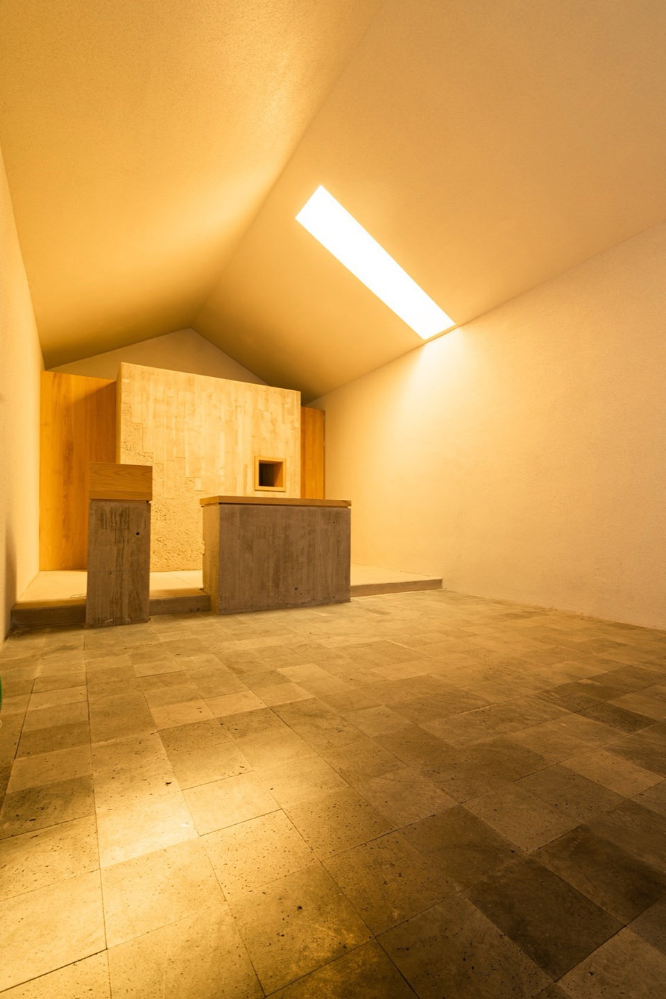 The new volume is resolved through a continuous white envelope that simplifies and reinterprets the historic nave without reproducing it. Its scale and height remain deliberately subordinate to the hermitage, avoiding any gesture of protagonism. The neutrality of its architecture enables a serene coexistence with the historic fabric, understood not as contrast but as continuity over time. Inside, a large skylight introduces natural light directly over the presbytery, making light the primary spatial agent and the element that articulates the experience of the church.