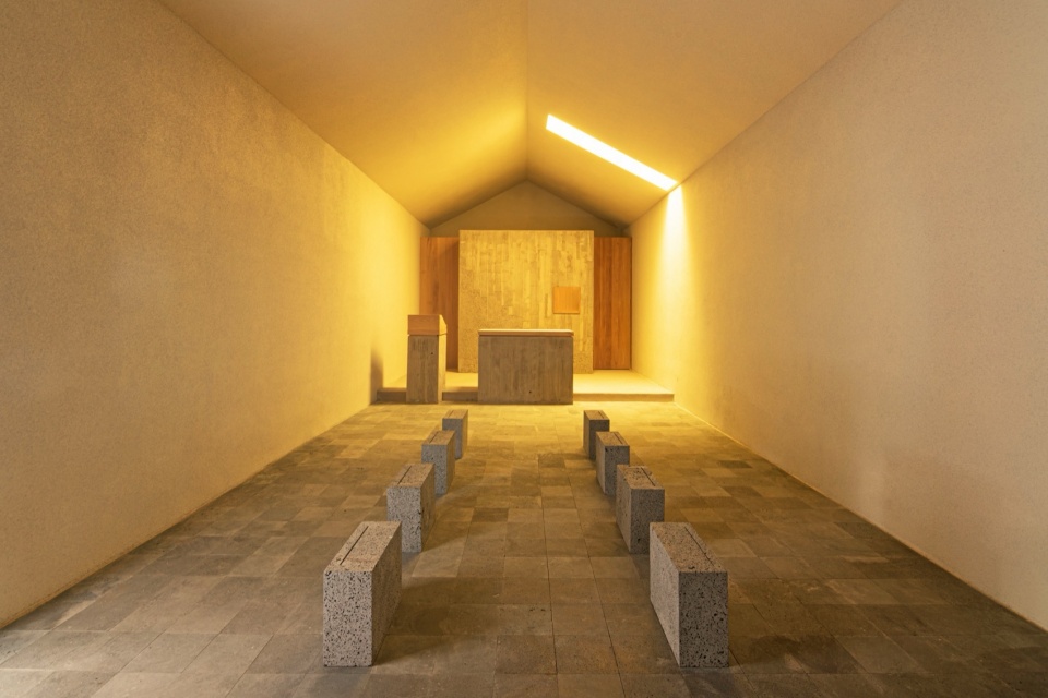 新体量的建构语言刻意保持节制。中殿采用砌块墙体结构,内外覆以连续喷涂的软木层,这一生态型、超薄的构造体系既回应了空间尺度的限制,也满足了热工与声学需求。其略显粗粝的表面微妙地调制着光的振动,同时营造出适合言语回响的声学环境,进一步强化了空间的礼仪属性。