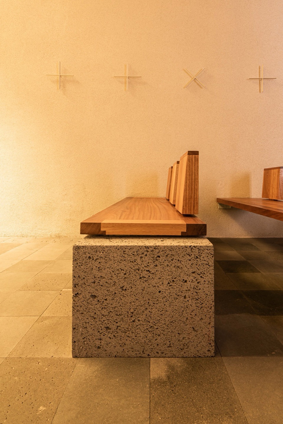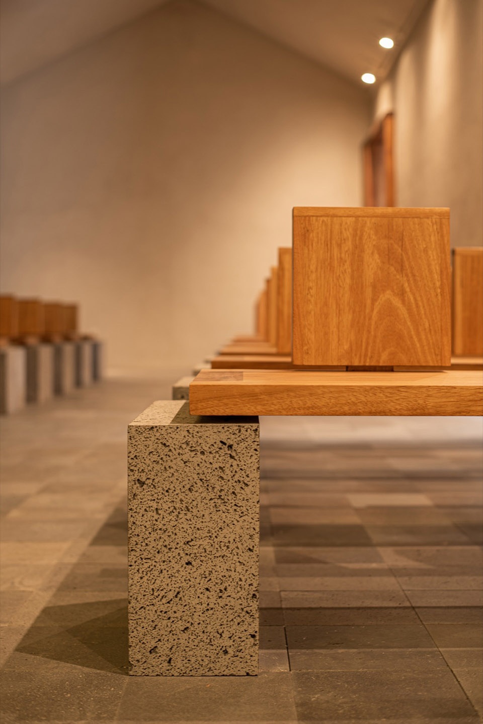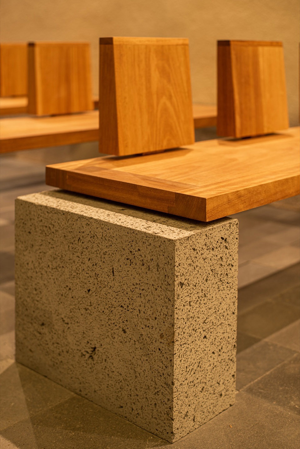 长椅被视为建筑不可分割的一部分而进行设计。每一个座位都配有独立的靠背,这一自主的构件承认个体的独特性与内在尊严。它们并非组成一条连续长椅,也不是模糊个体的集体姿态,而是多重“在场”的叠加——人们在保持自身状态的同时,共同构成一个整体。木质座椅安放在玄武岩石基之上,这种传统、厚重而稳定的材料如同根基一般存在。视觉上的轻盈由一种古老而密实的物质所承托,在人之脆弱与恒久之物的沉默重量之间,建立起清晰而深刻的关系。
