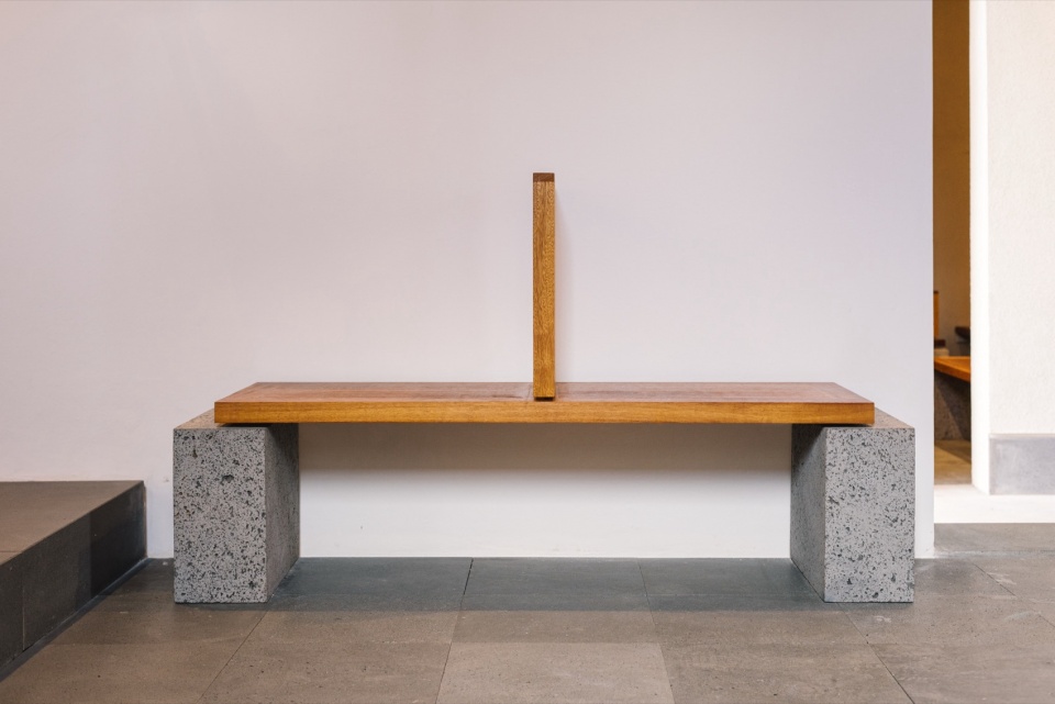 The benches were conceived as an integral part of the architecture. Each seat incorporates an individual backrest, an autonomous element that acknowledges the singularity of each person and their inherent dignity. Rather than forming a continuous bench or an undifferentiated collective gesture, they constitute a sum of presences: individuals who, without losing their own condition, participate in a single body. These timber elements rest on basalt stone bases-traditional, heavy and stable-acting as a foundation. The visual lightness of the benches is thus supported by a dense and ancestral material, establishing a clear relationship between the human and the permanent, between the fragility of the seated body and the silent weight of what sustains it.