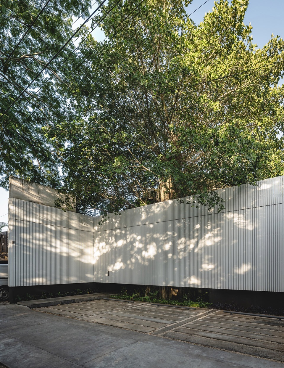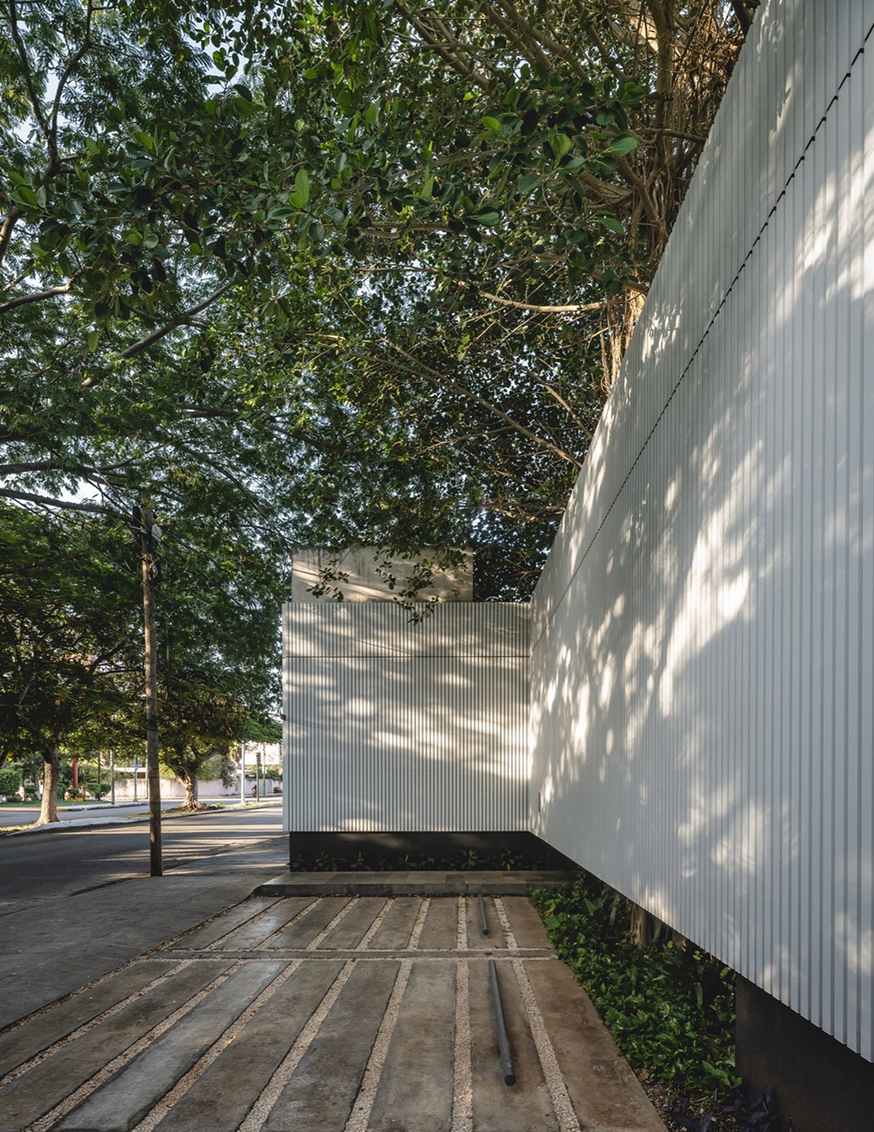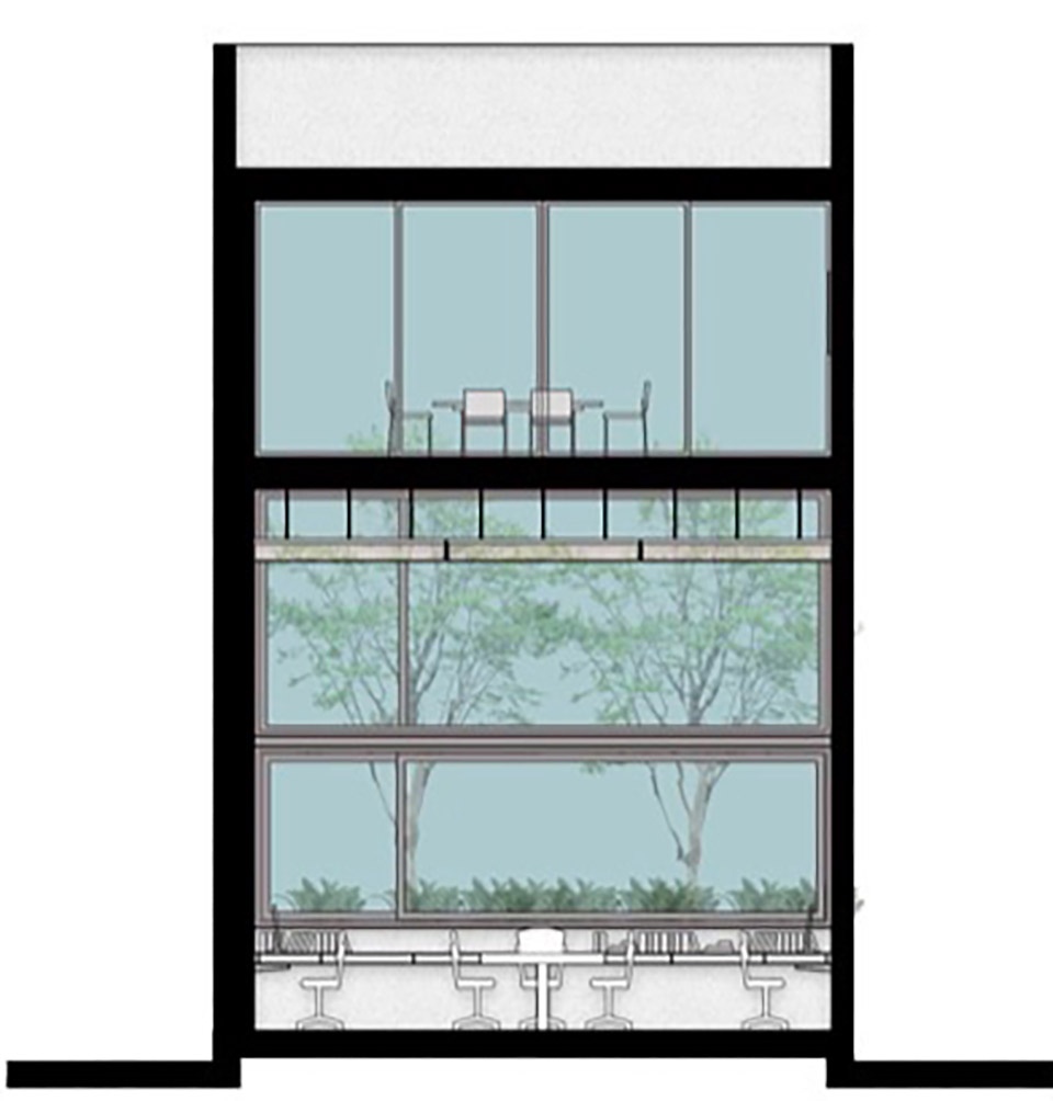 The play of natural light with the trees on the main facade becomes a daily celebration, transforming the building into a living canvas that shifts with the day’s progression. As night falls, this facade, a latticework of vertical white aluminum elements, shines like an urban beacon, broadcasting the vibrant pulse within and the majestic alamo tree that welcomes both regulars and newcomers.