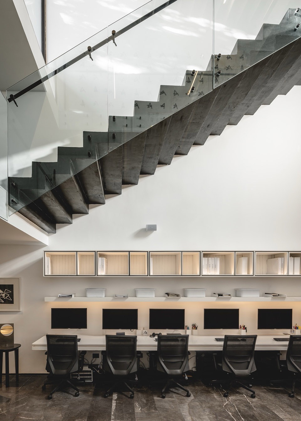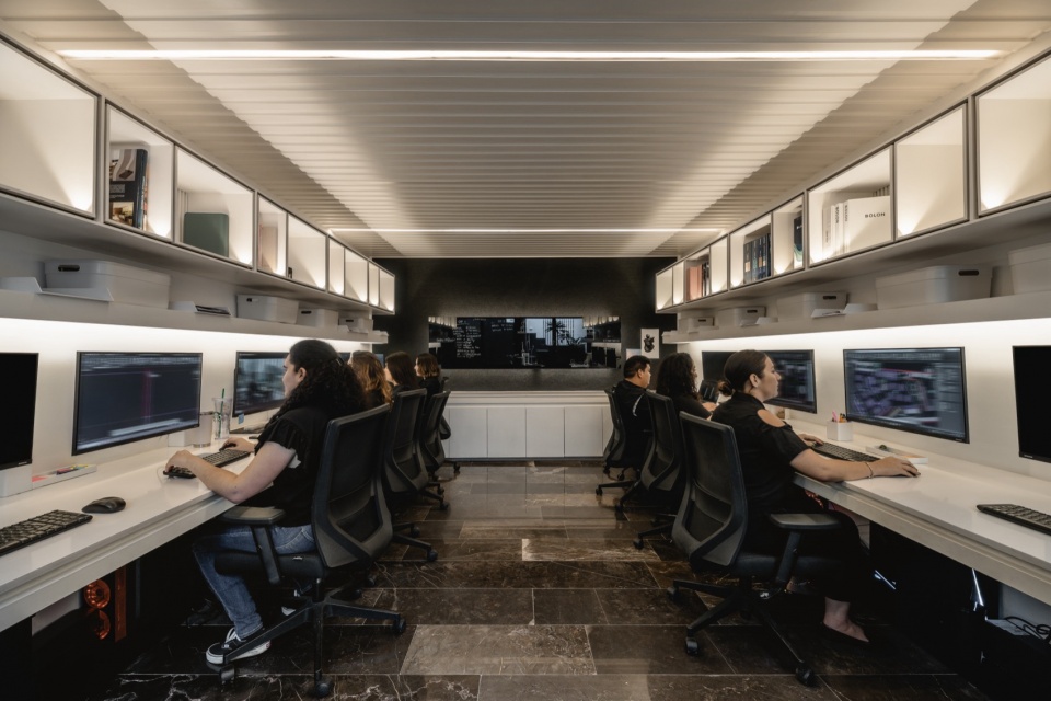 工作坊无疑是 THE ASYLUM 的核心与灵魂。挑高的空间与开放式布局,映射出 Arkham 的工作方式:协作、动态、持续演进,也直观呈现出支撑事务所运作的真正力量——人。从这里可以一览建筑内部的整体关联:带有全景视野的私密空间,以及为休憩与放松而设的角落,共同构成一张紧密联系的空间网络。