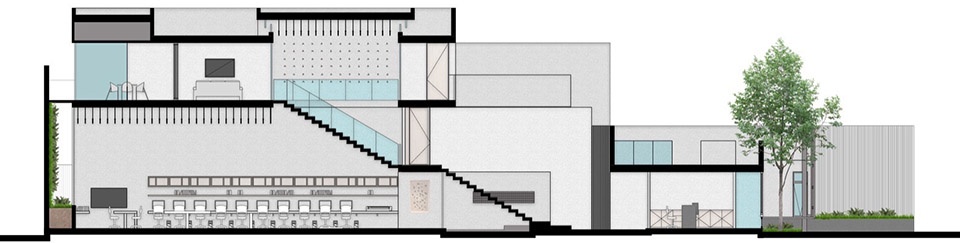 主立面上,自然光与树影的交织成为每日上演的视觉庆典,使建筑宛如一块随时间变化的“活画布”。夜幕降临后,由白色铝制竖向构件组成的立面如同城市中的灯塔,向外传递着内部的活力脉动,以及迎接新老访客的雄伟阿拉莫树的存在感。